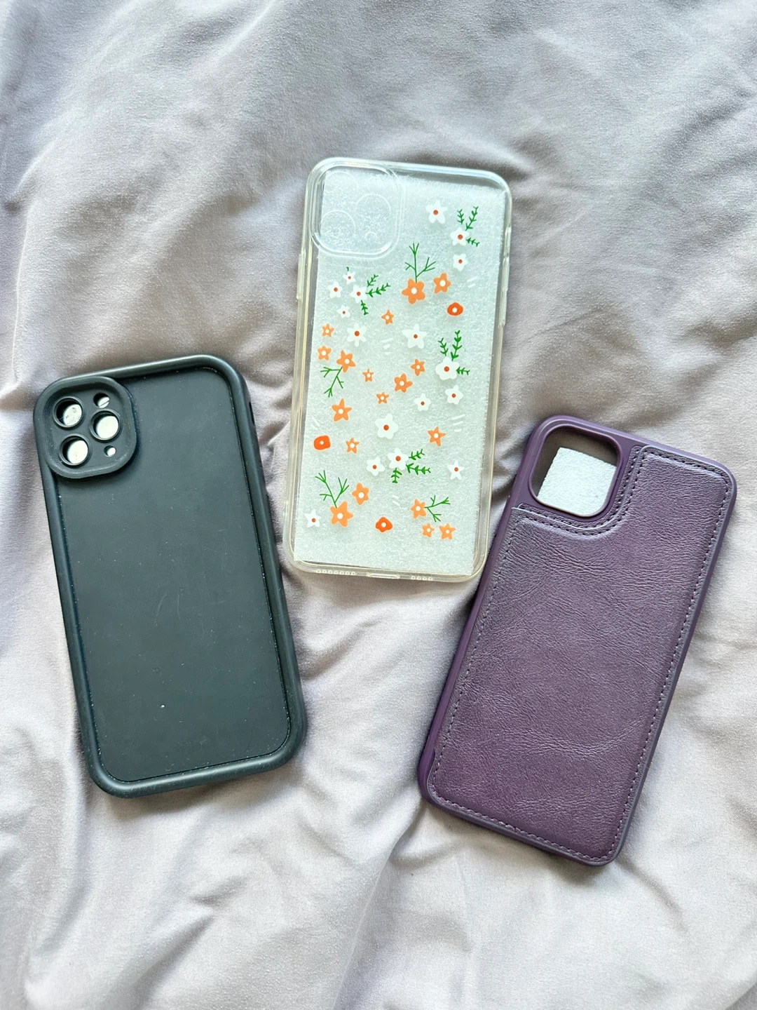 Selling a set of three iPhone 11 pro max phone cases. One is black, one is clear with a floral design, and the other is a purple wallet case. All in great condition!