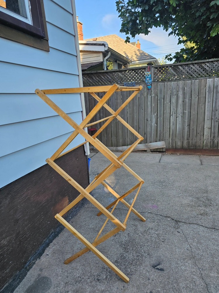 Selling a wooden clothes drying rack! It's in great shape and ready to help you save on dryer costs. Folds up easily for storage when not in use. Stand roughly 5 feet tall when up. Sturdy and Strong, they dont make them like this anymore!