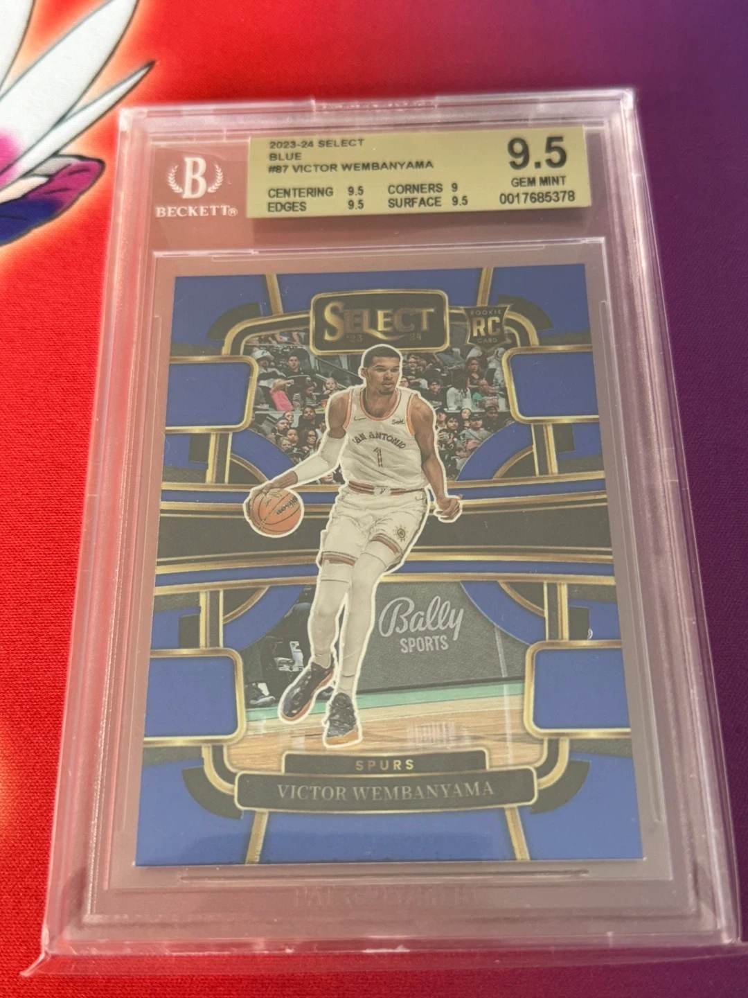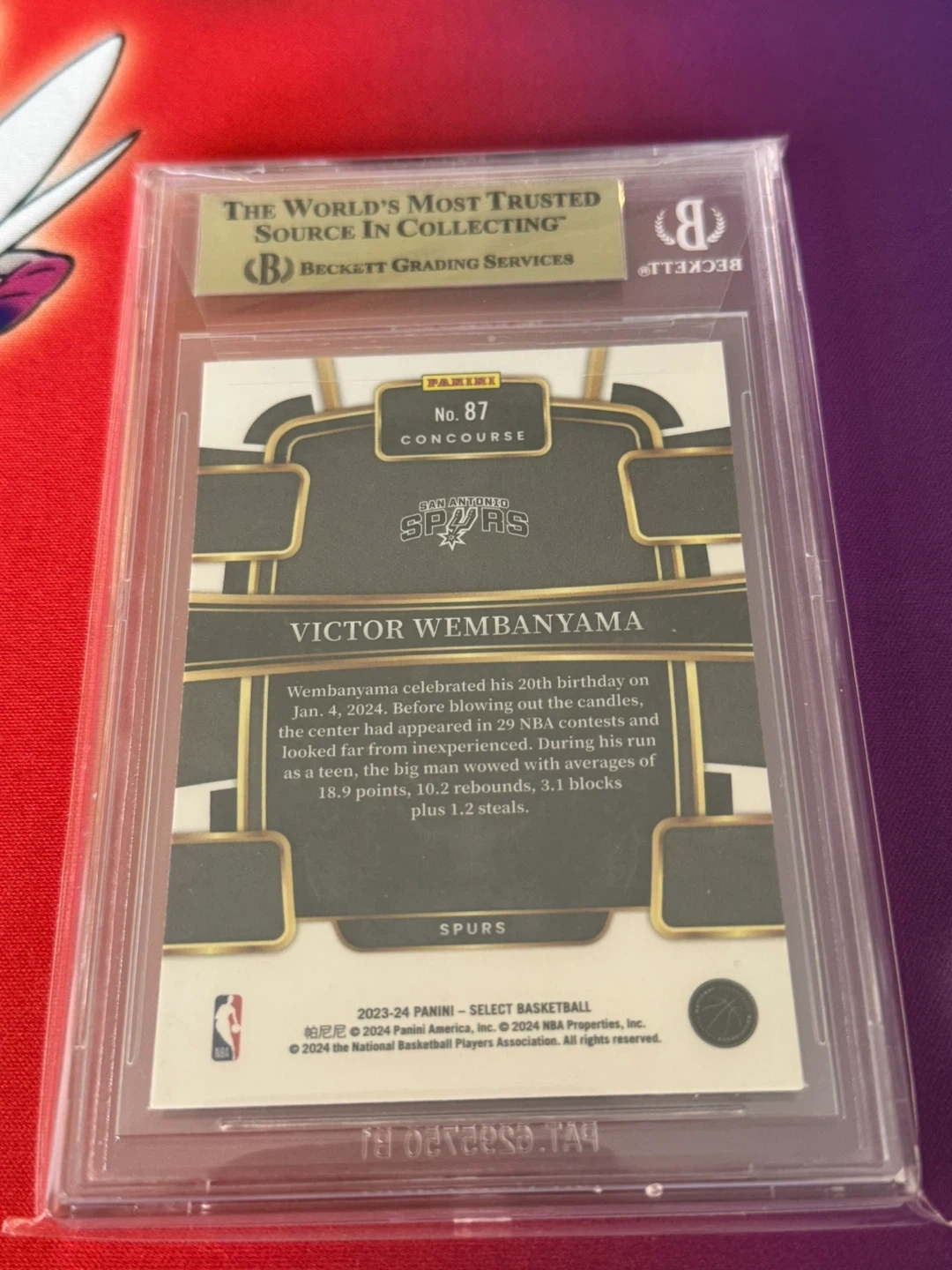 Selling a graded Victor Wembanyama basketball card! - 2023-24 Select Blue - Card #87 - Graded by Beckett (BGS) at 9.5 Gem Mint - Centering: 9.5 - Edges: 9.5 - Corners: 9 - Surface: 9.5 This card commemorates Wembanyama's 20th birthday and highlights his impressive stats as a rookie for the San Antonio Spurs