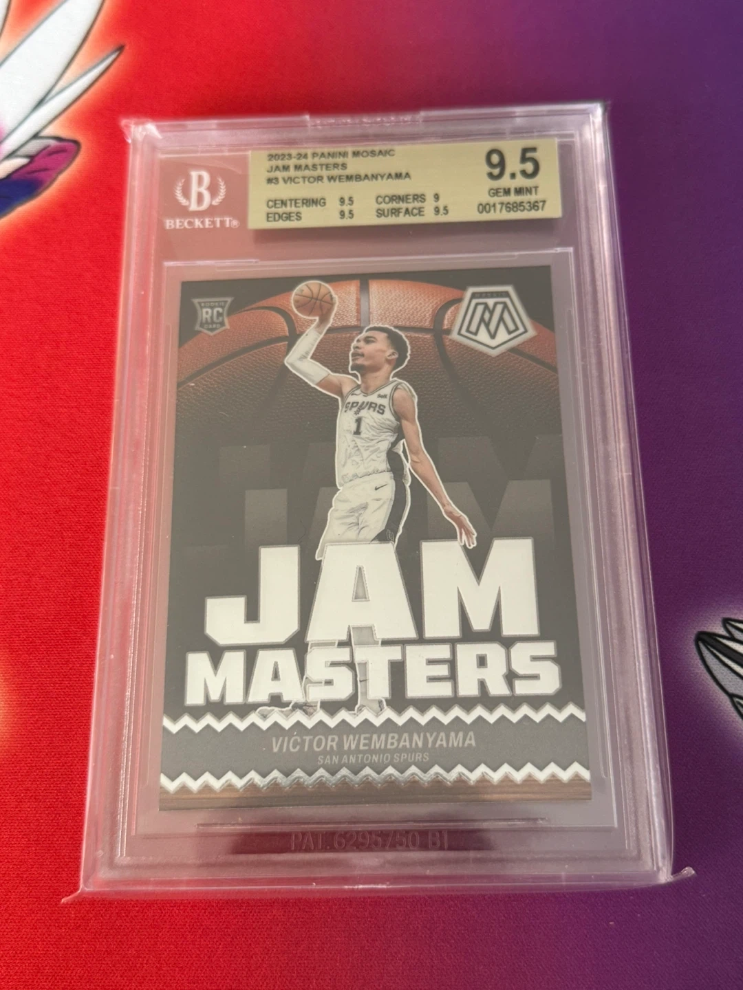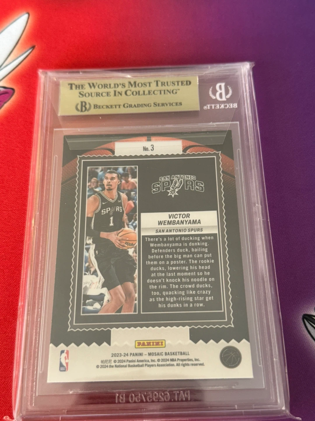 Selling a Victor Wembanyama 2023-24 Panini Mosaic Basketball card. It's graded 9.5 Gem Mint by Beckett Grading Services (BGS). A great addition for any basketball card collector!