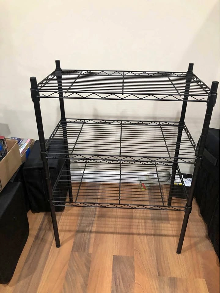 This metal shelving unit has three tiers, adjustable feet, and adjustable shelves for total customization. It is in good used condition. There is a small dip in the top in one spot that you can only see if you’re looking the right way. Price reflects this. I also added soft pads to the bottom of the feet so they didn’t scuff the floor, but you can take those off if you wanted to.