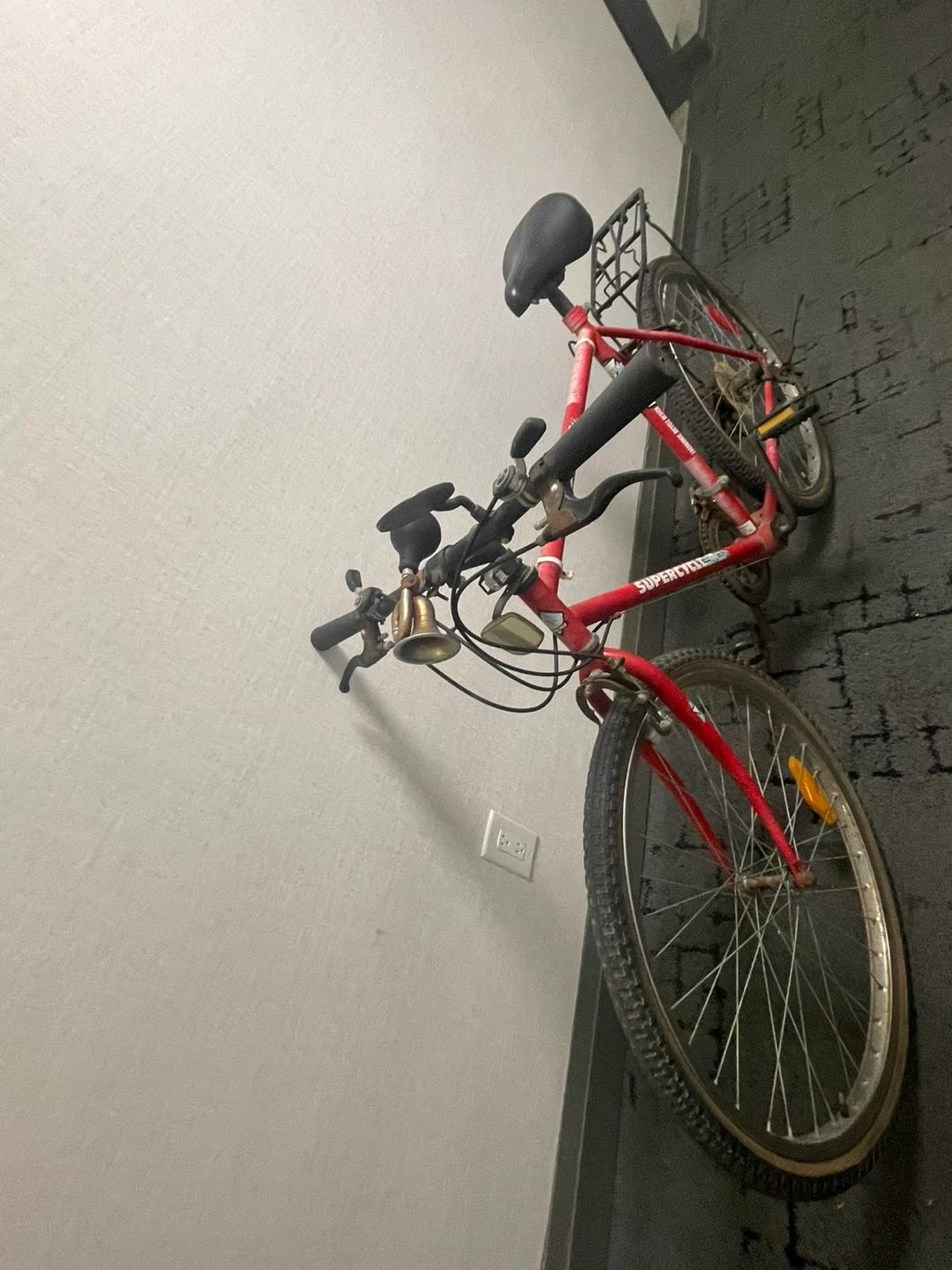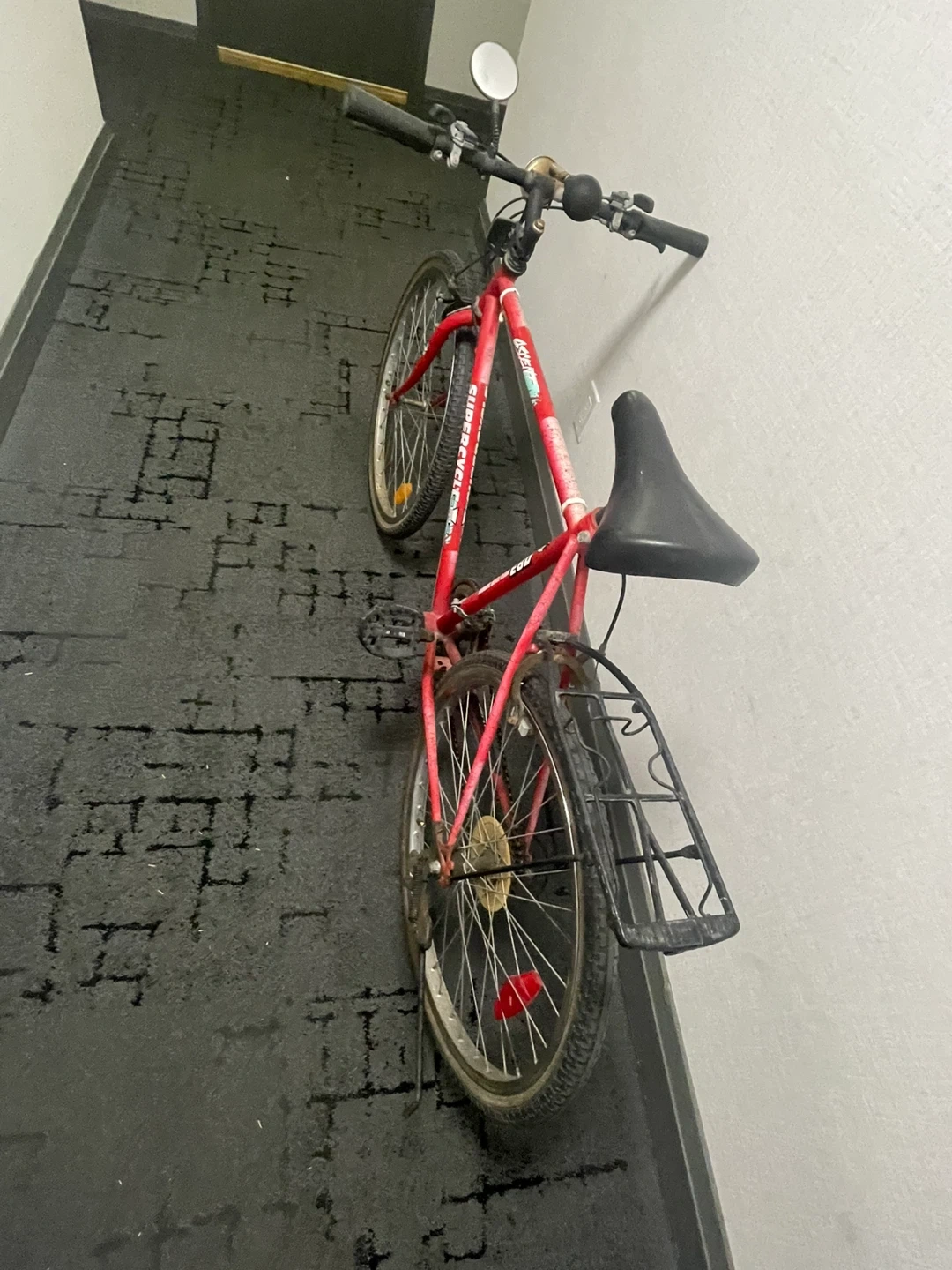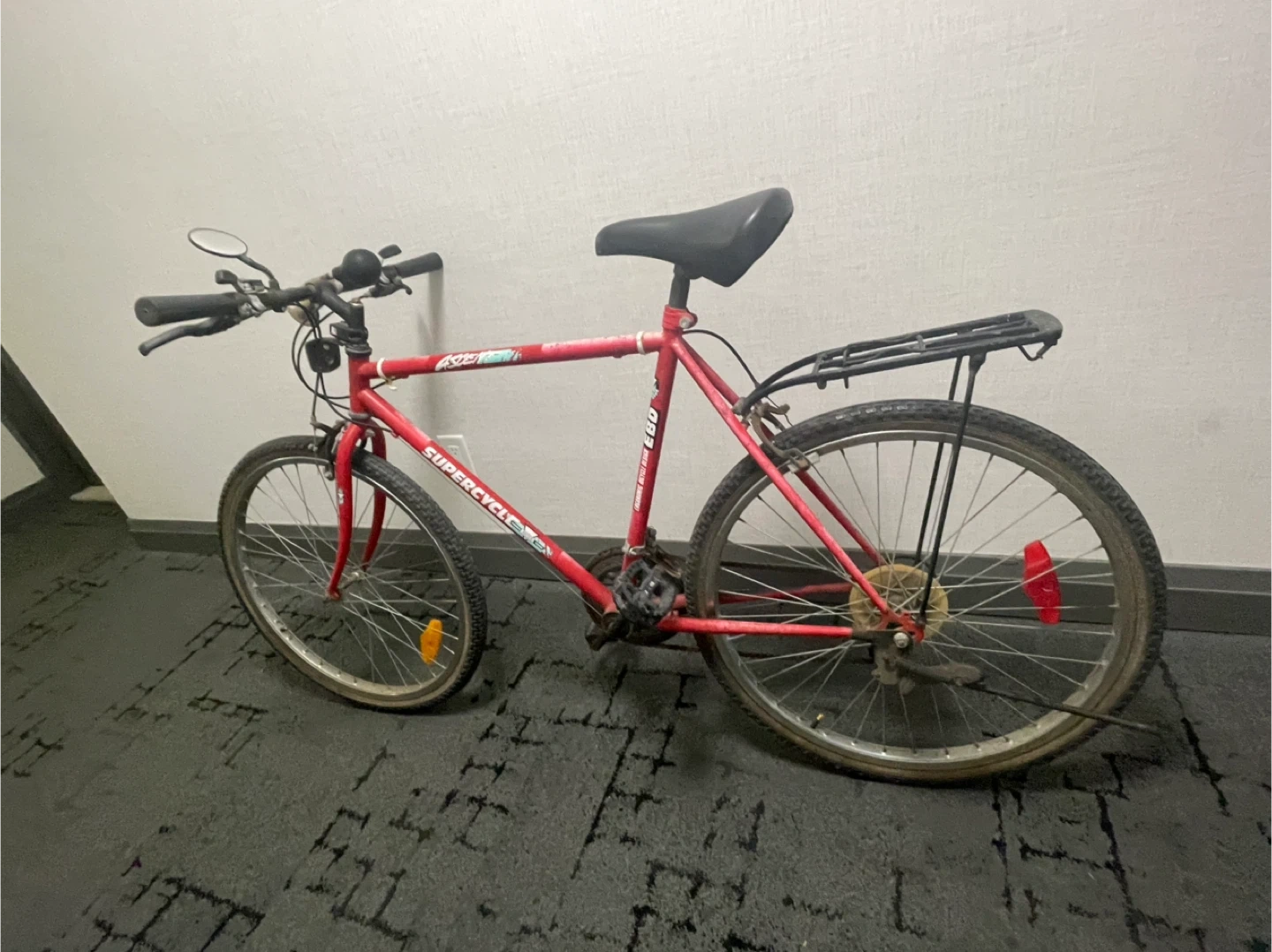 Selling a red Supercycle A2500 mountain bike. It's in good used condition and ready for some new adventures! It has a black seat and a rack on the back for carrying your essentials
