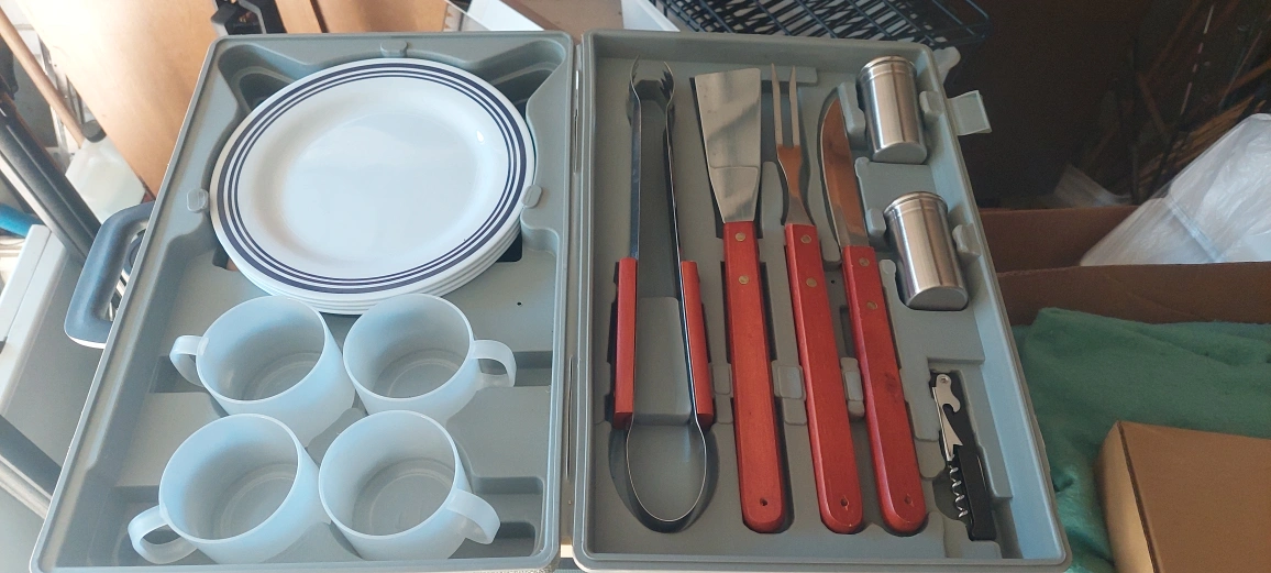 107Selling a complete picnic set from Sports & Soul! It includes plates, cups, cutlery, and more, all neatly organized in a carrying case. Perfect for outdoor adventures and picnics in the park