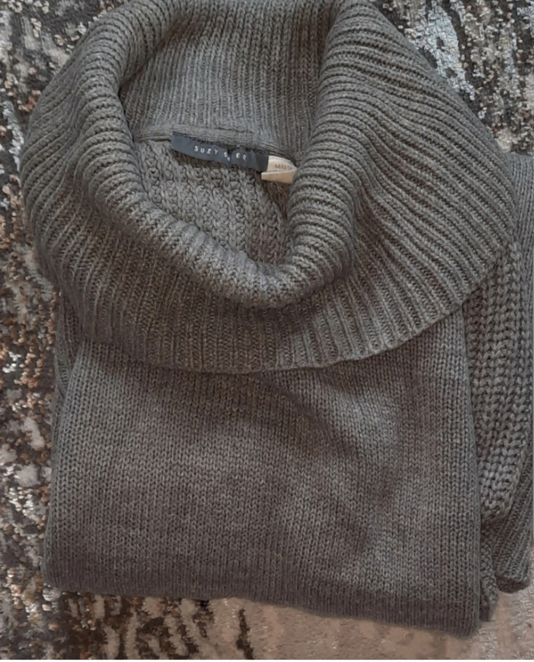 Cozy up in this grey knit sweater dress from Suzy Shier! It features a stylish cowl neck and is a size medium. Perfect for layering on chilly days!