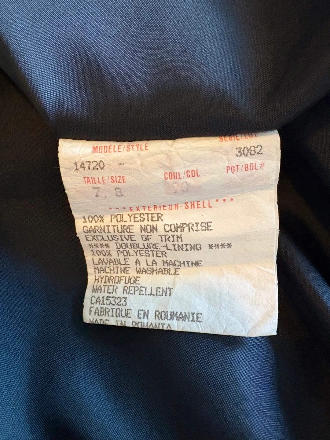 * Material: 100% Polyester (shell and lining)