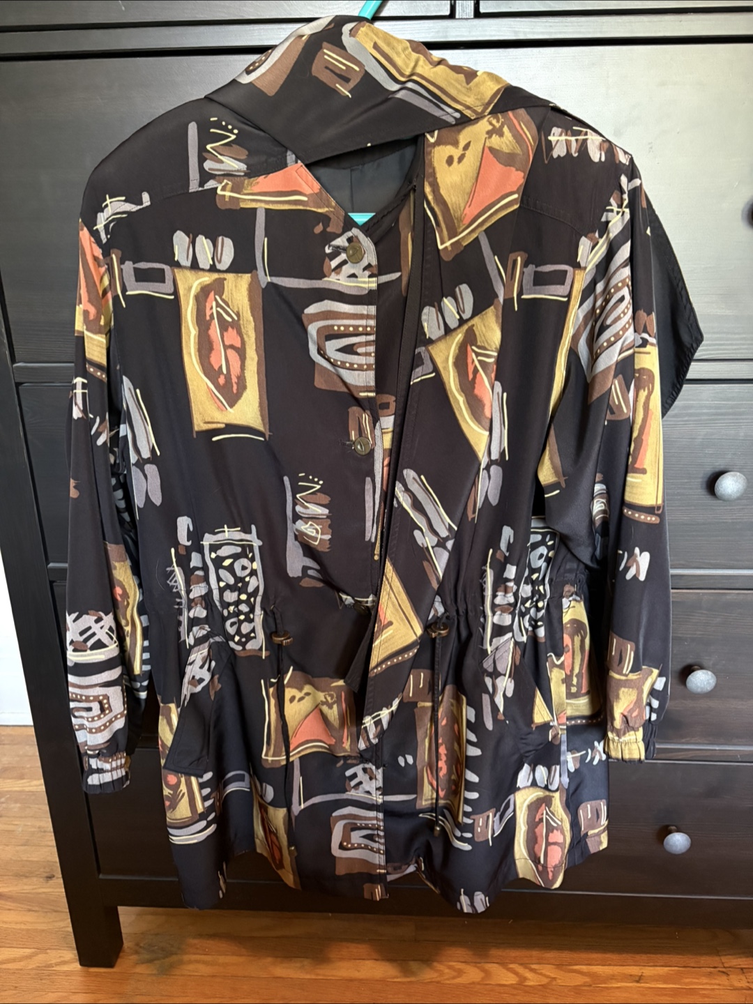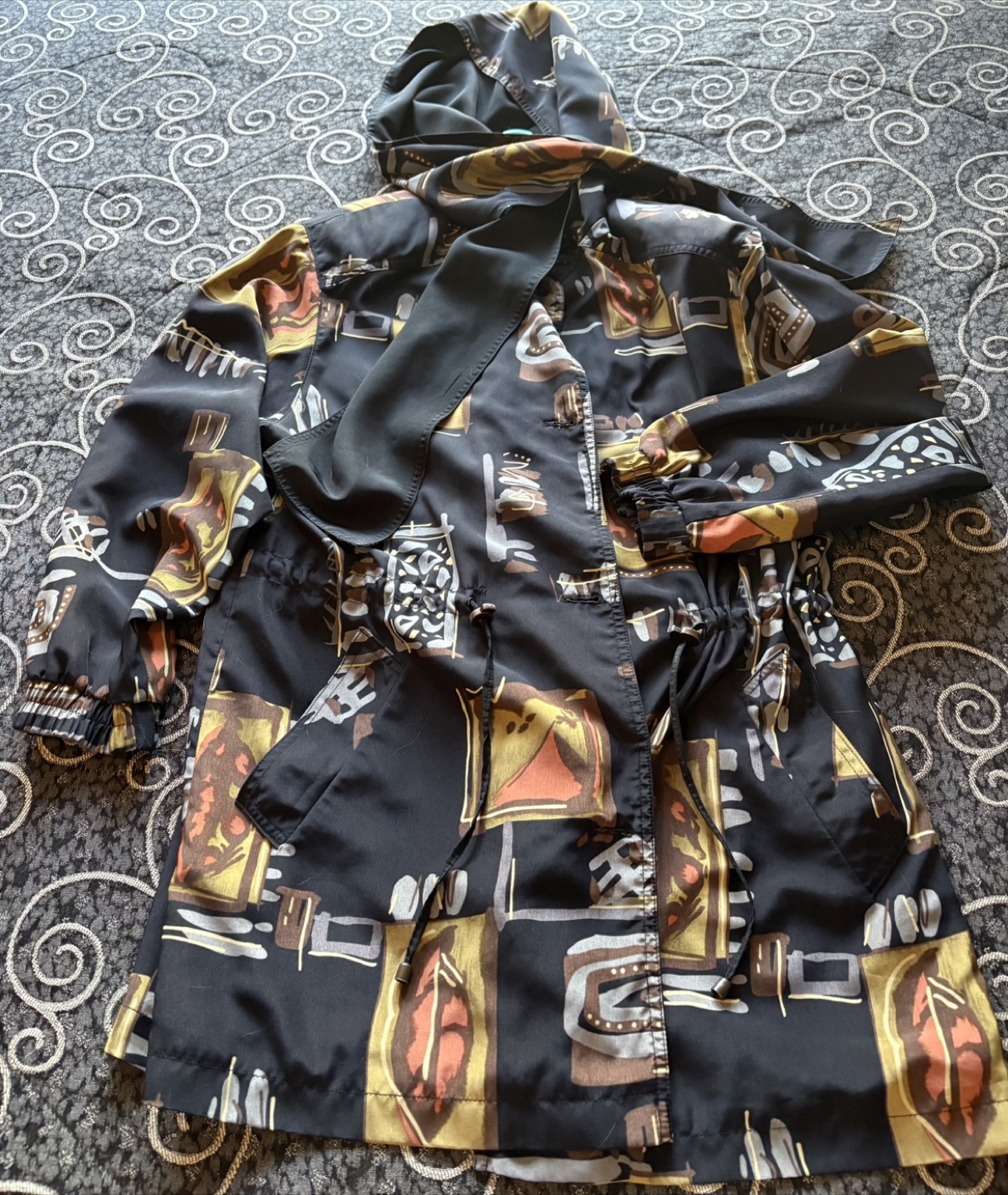 This Maryse Roye hooded jacket is a stylish and functional piece, perfect for light weather conditions. The jacket features a unique graphic pattern and is made from water-repellent material, making it ideal for unpredictable weather. The drawstring waist and hood allow for an adjustable fit, blending practicality with a fashionable edge.