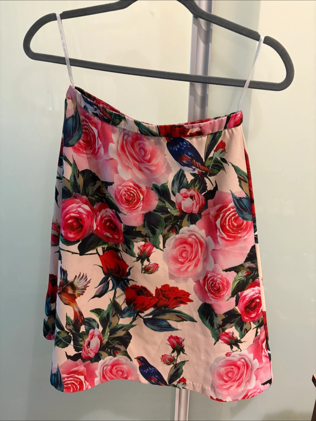 Here's a lovely floral A-line skirt that's in great condition! The skirt features a beautiful rose pattern with red and pink hues, perfect for adding a touch of elegance to your wardrobe. Like new condition. Waist: 13” Waist to hem 22” Across: 15.5” Pick up and CASH ONLY. Location: The East Mall