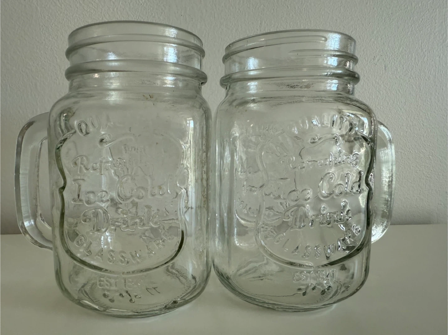 Selling a set of two clear glass mugs with handles, perfect for iced drinks. Also included is a white pitcher.