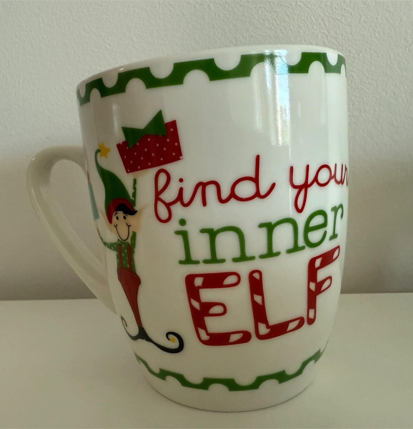 A cute Christmas mug with an elf design.