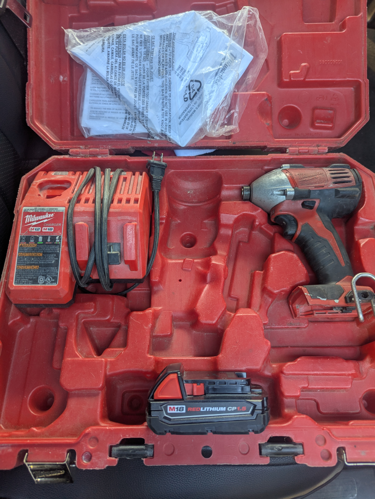 Selling a Milwaukee M18 impact driver kit! It comes with the impact driver, charger, and an M18 REDLITHIUM CP1.5 battery. Also includes the original case and manual