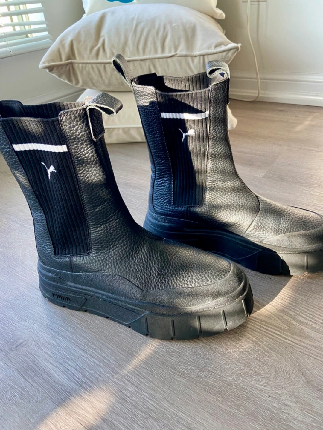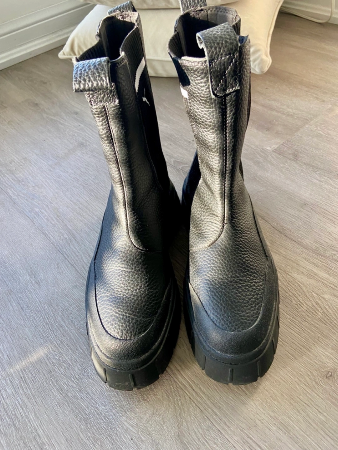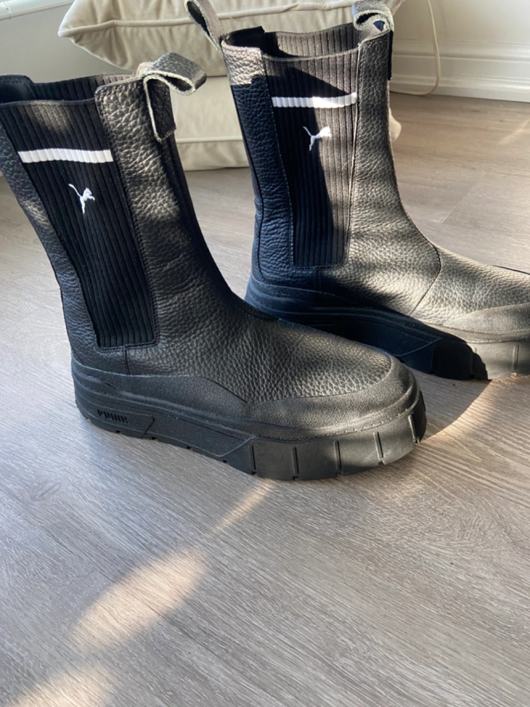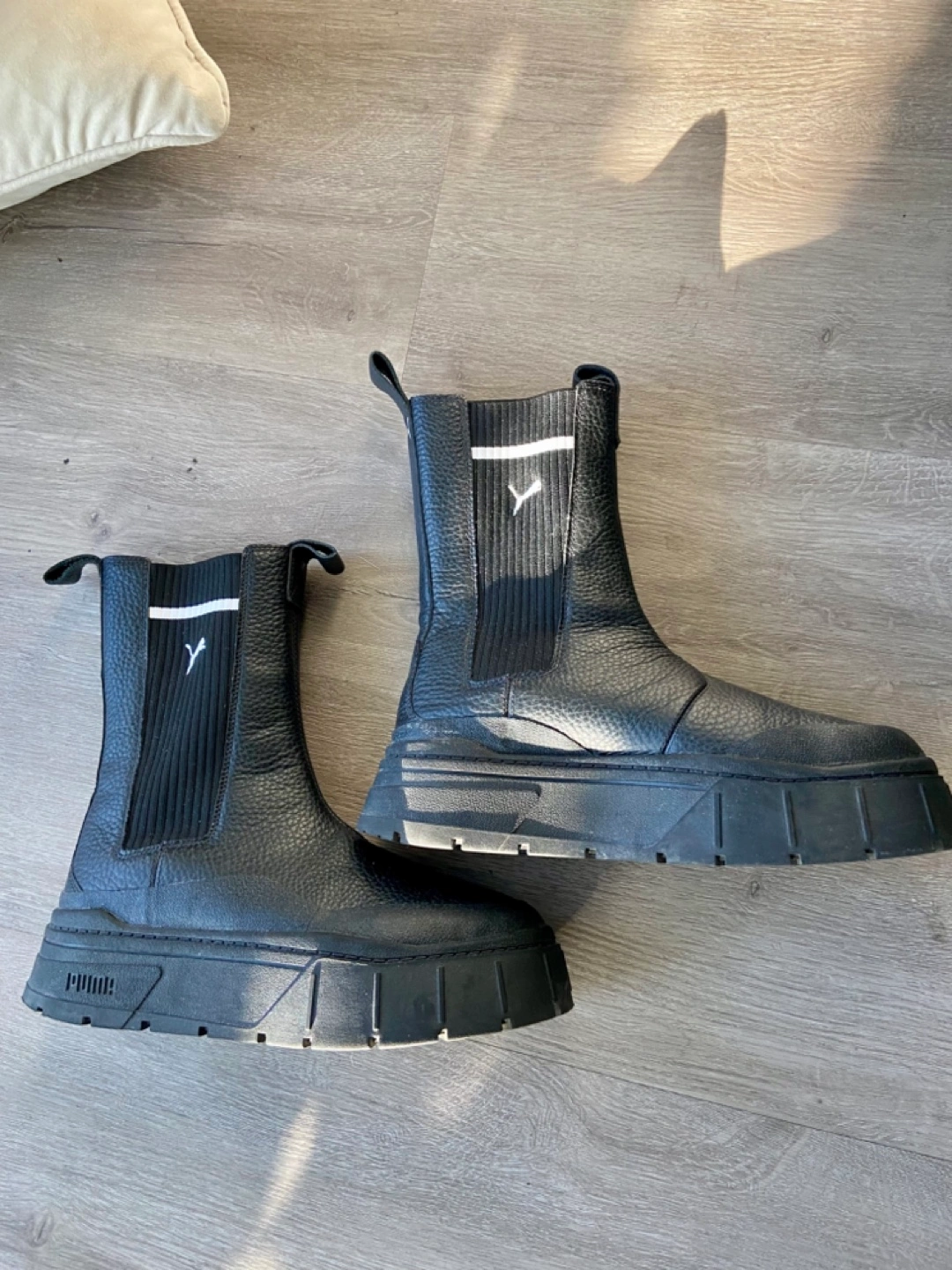 Selling a pair of Puma Mayze Chelsea boots in black leather. They are in great condition and very stylish! Perfect for adding a bit of edge to any outfit