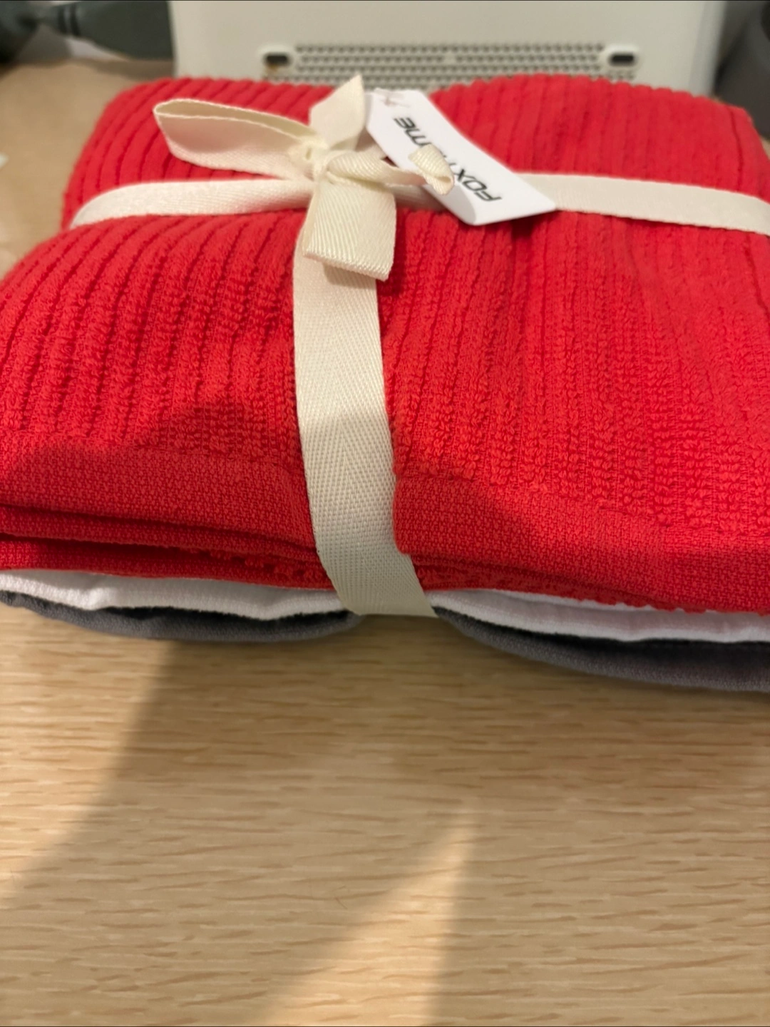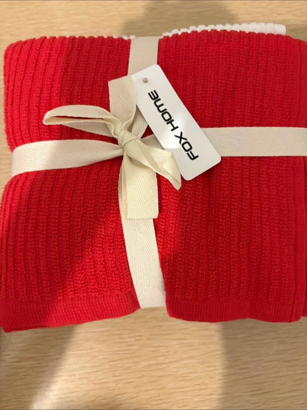 Selling a brand new set of Fox Home towels! The set includes towels in red, white, and grey, all neatly bundled with a ribbon. Perfect for adding a fresh touch to your bathroom or kitchen. New with tag. Pick up and CASH ONLY. Location: The East Mall