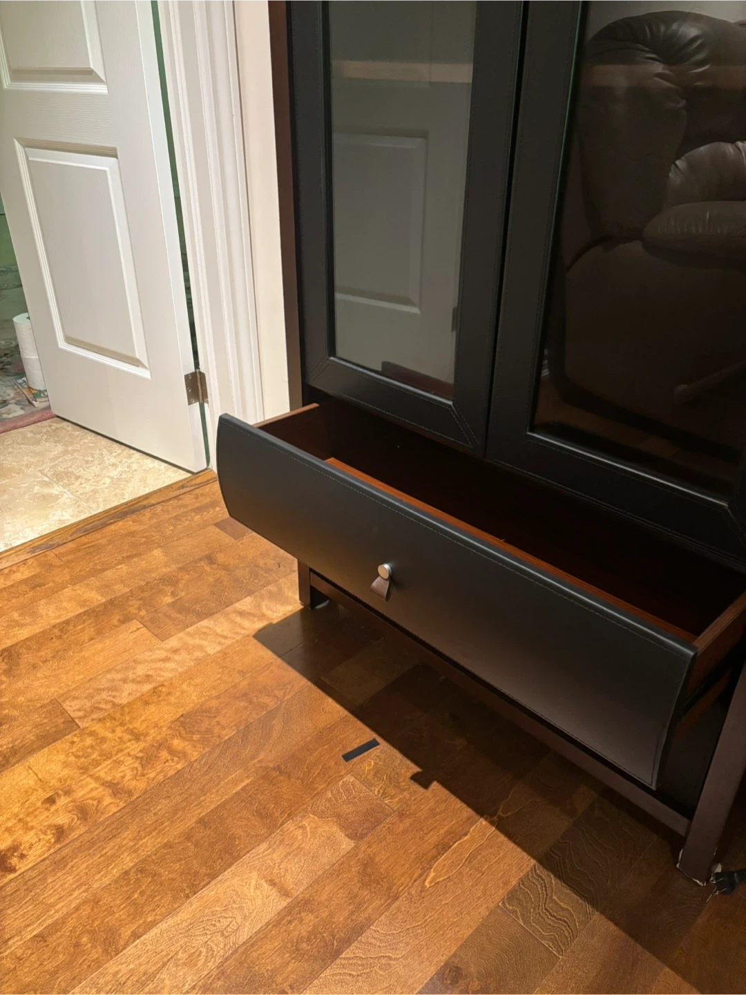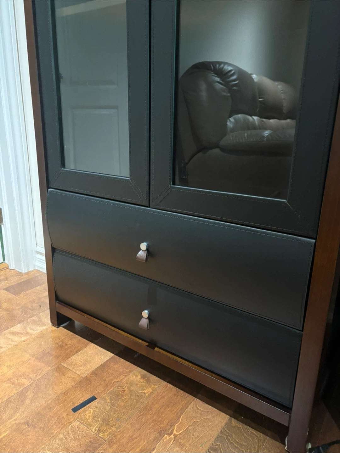 The front panels are trimmed with black genuine leather. Was used in a home theatre for the equipment.