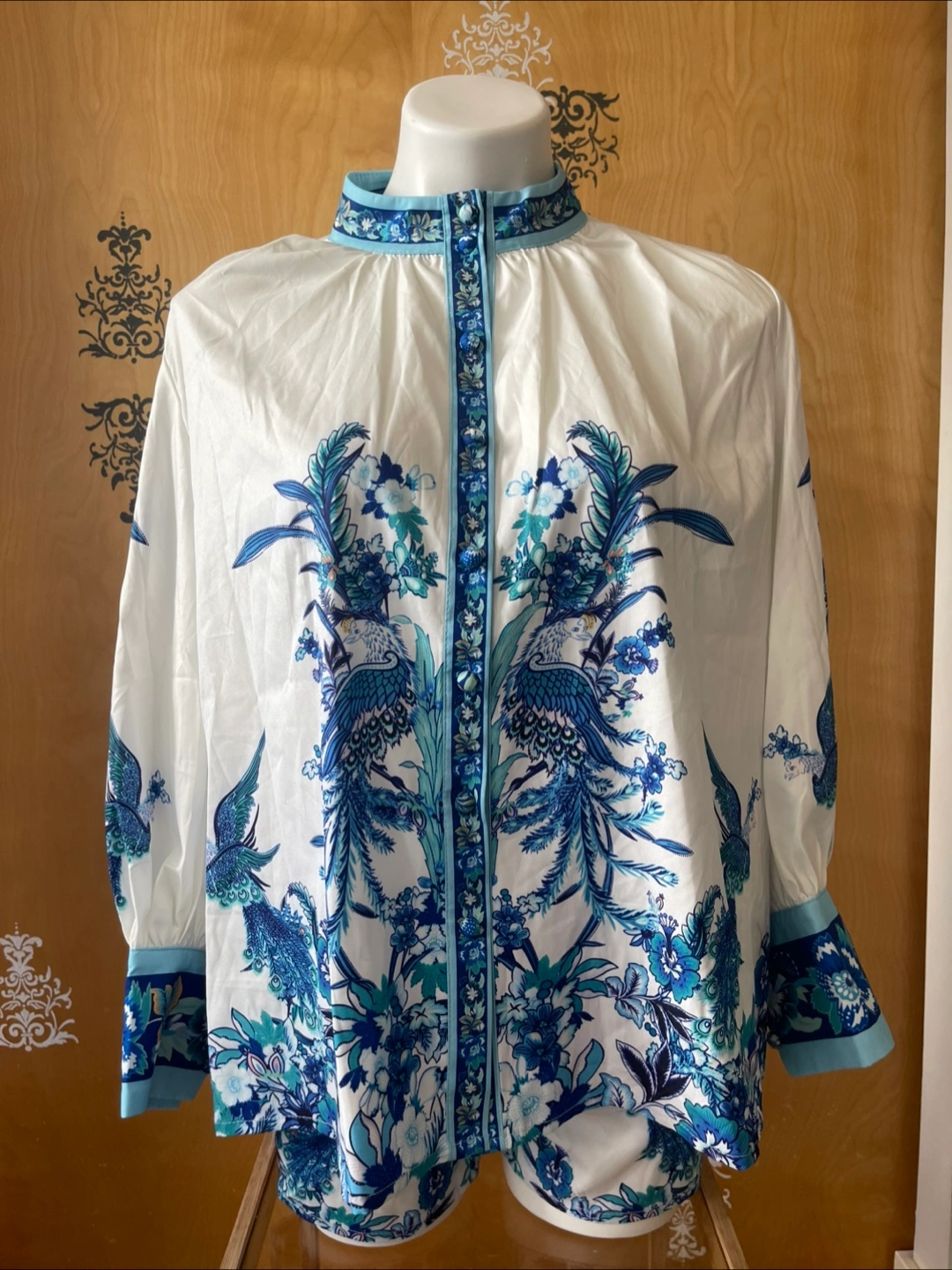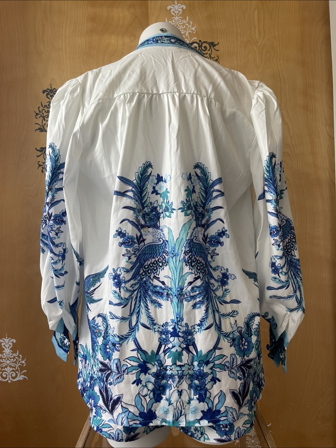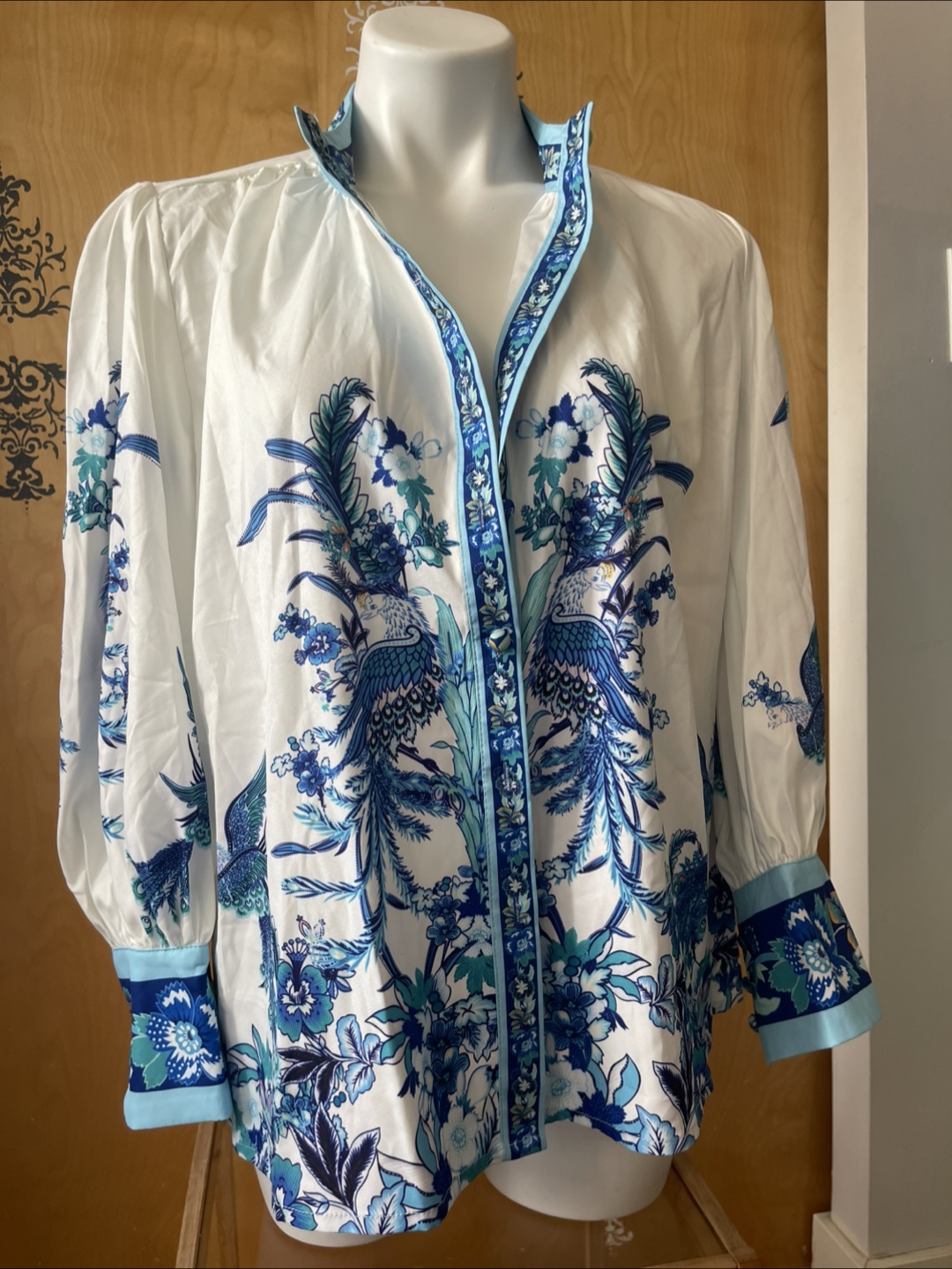 Colour: White blouse w/ floral design pattern in colours of blues & green