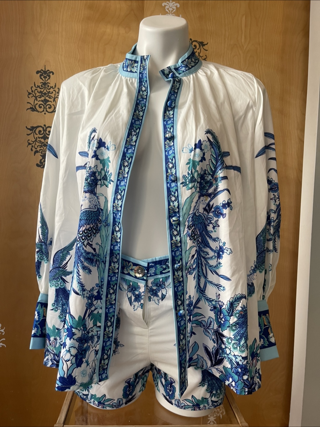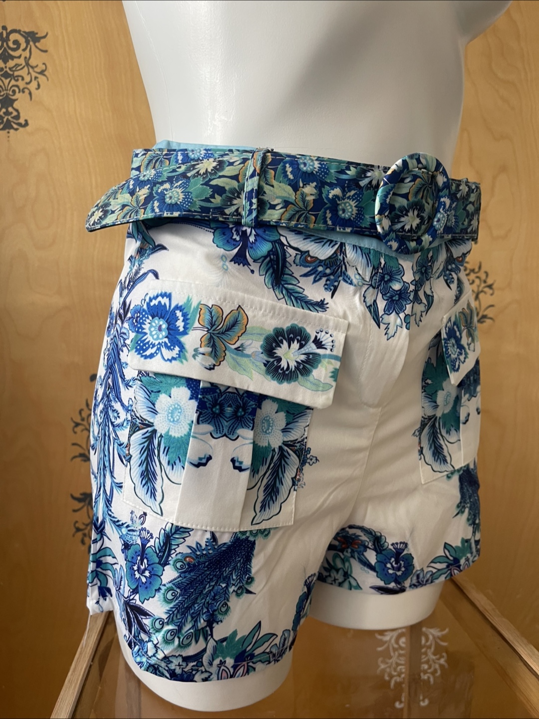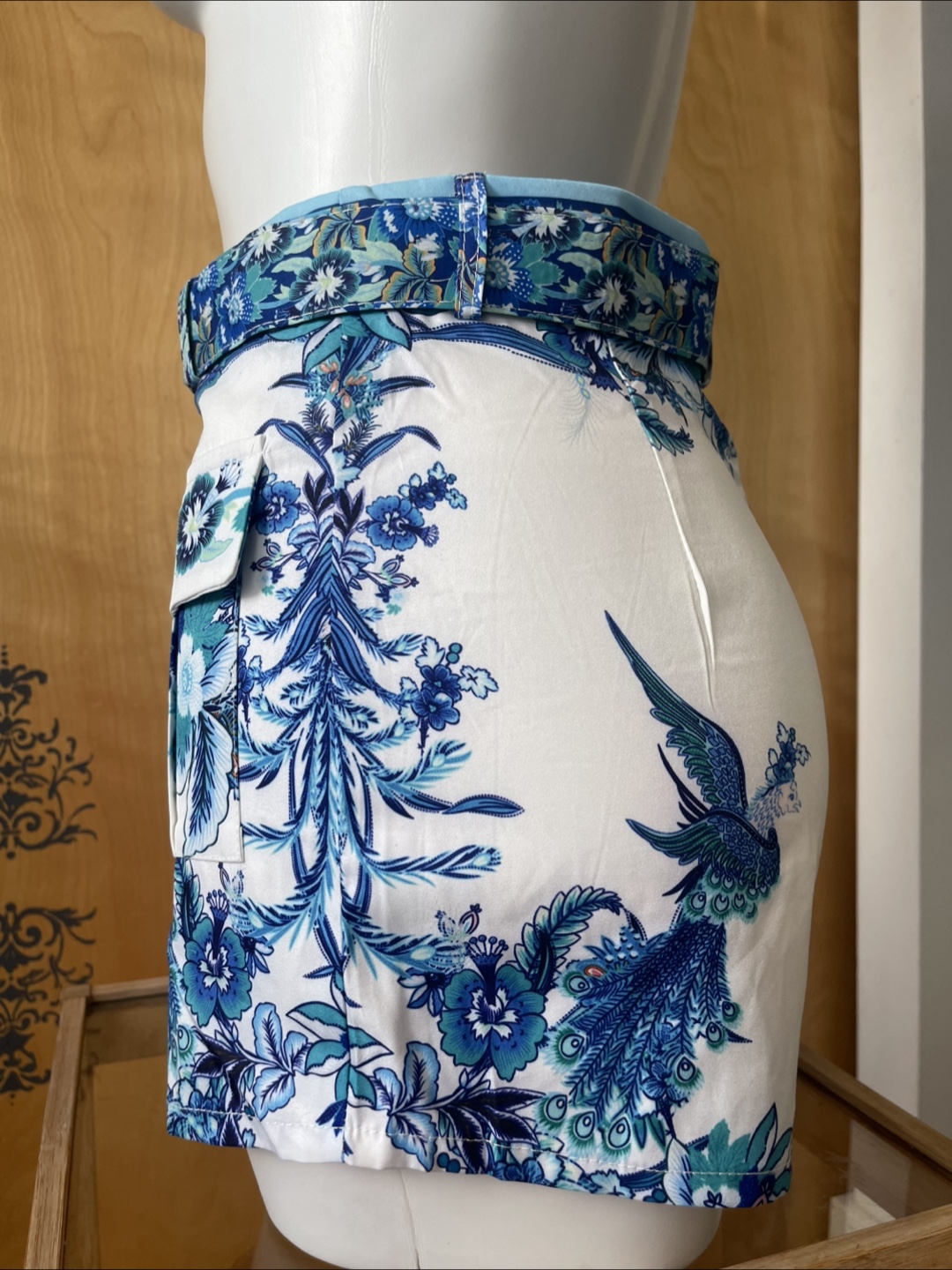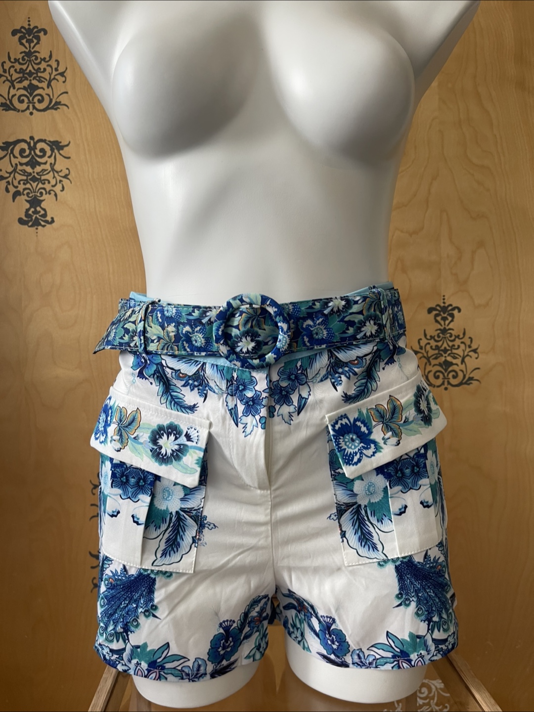 Colour: White blouse w/ floral design pattern in colours of blues & green