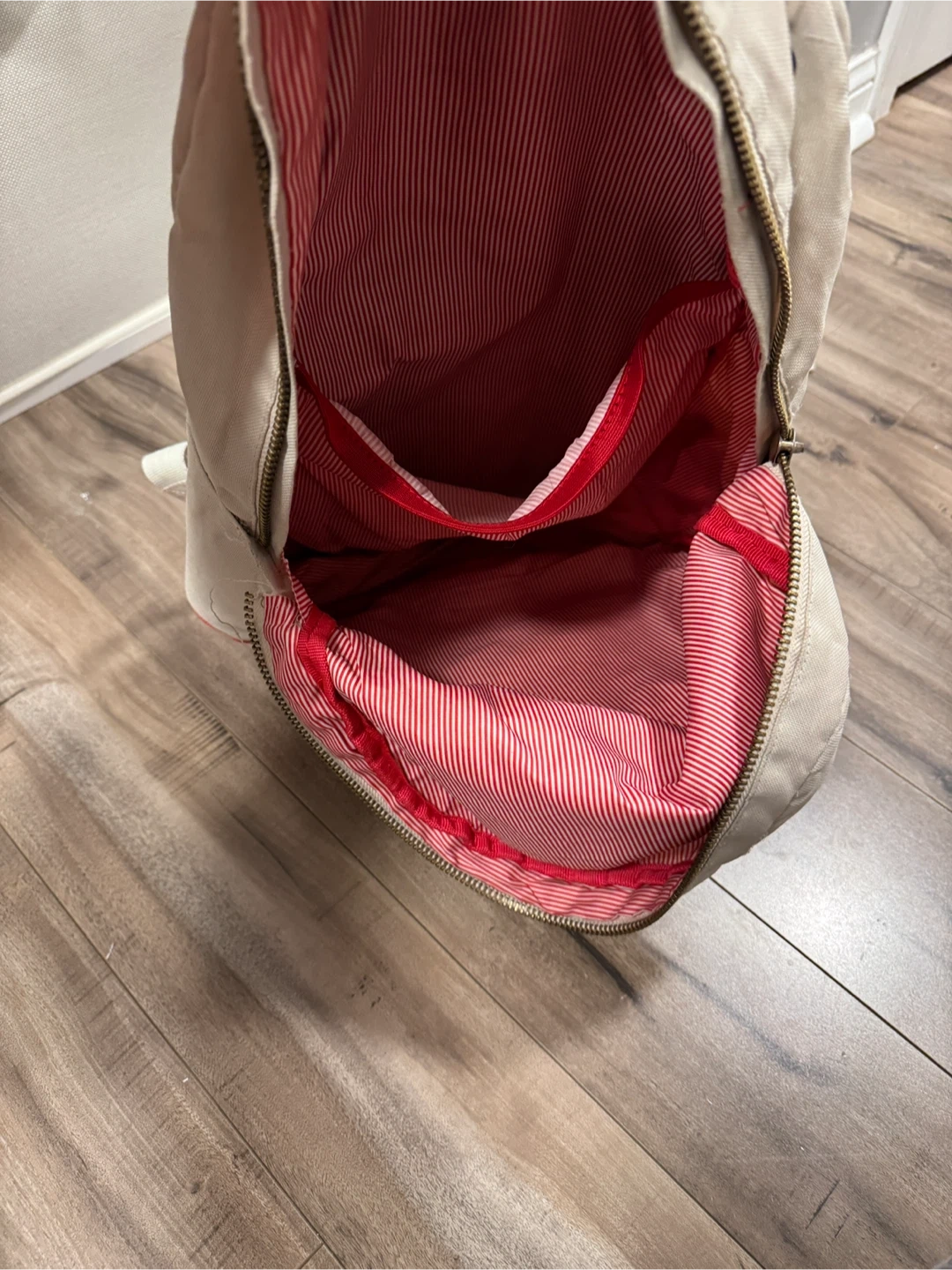 Herschel backpack in beige and red. It's got a red and white striped interior. There are some signs of use on the front, but it's still a useful backpack!
