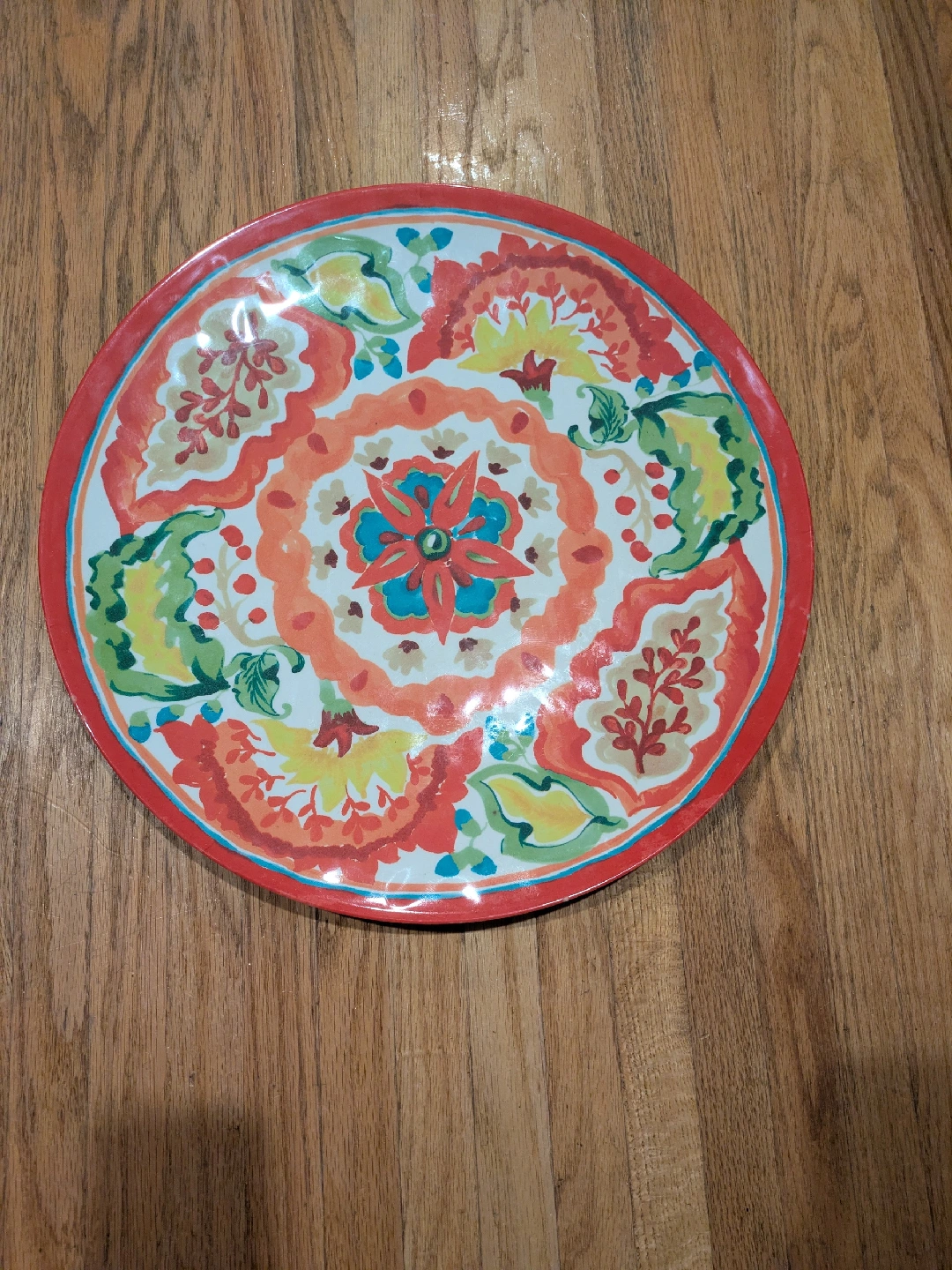 This is a Better Homes & Gardens round melamine platter in great condition! It features a colourful floral design on the front and a solid white back. Perfect for serving snacks or appetizers at your next gathering!