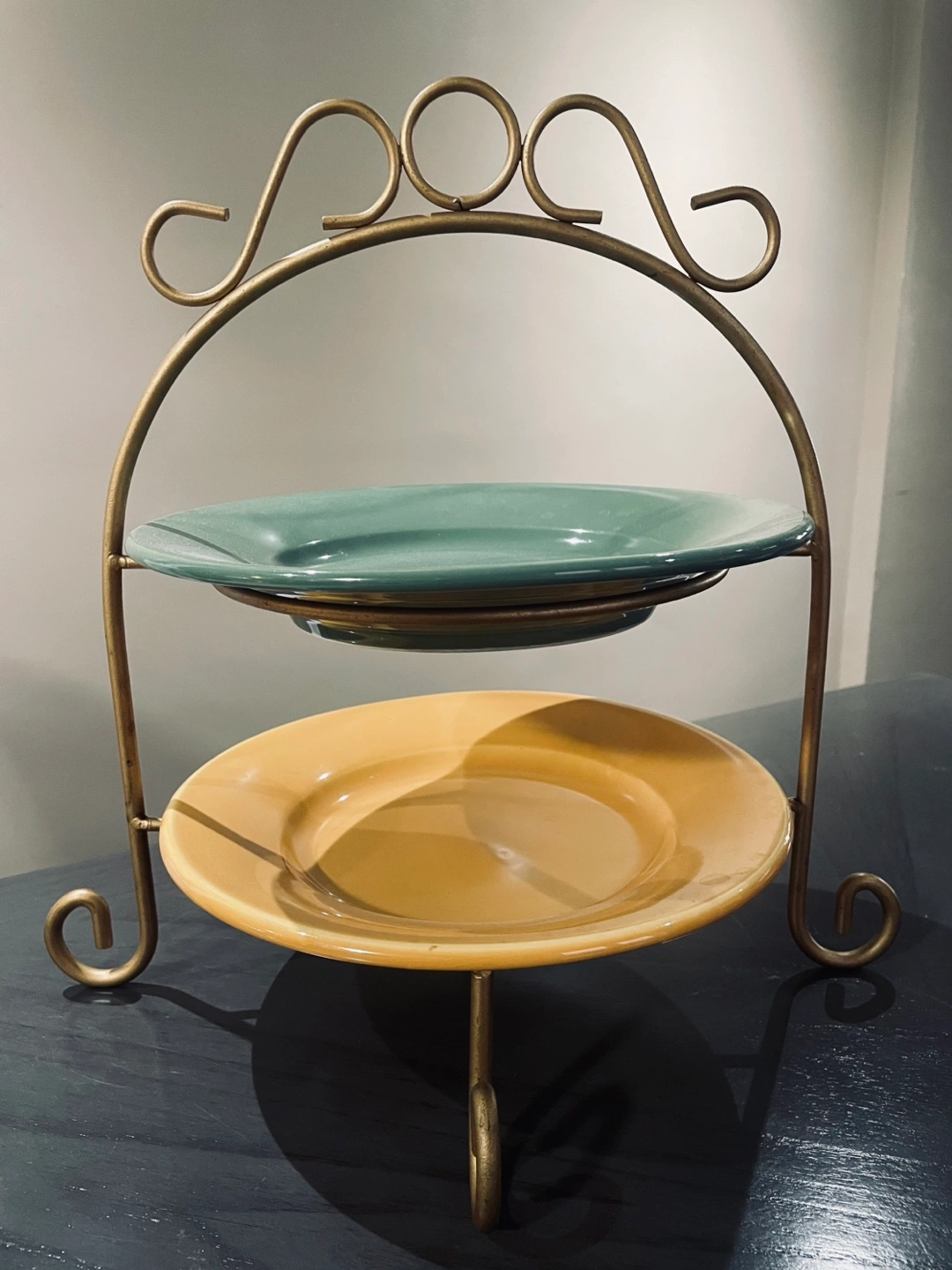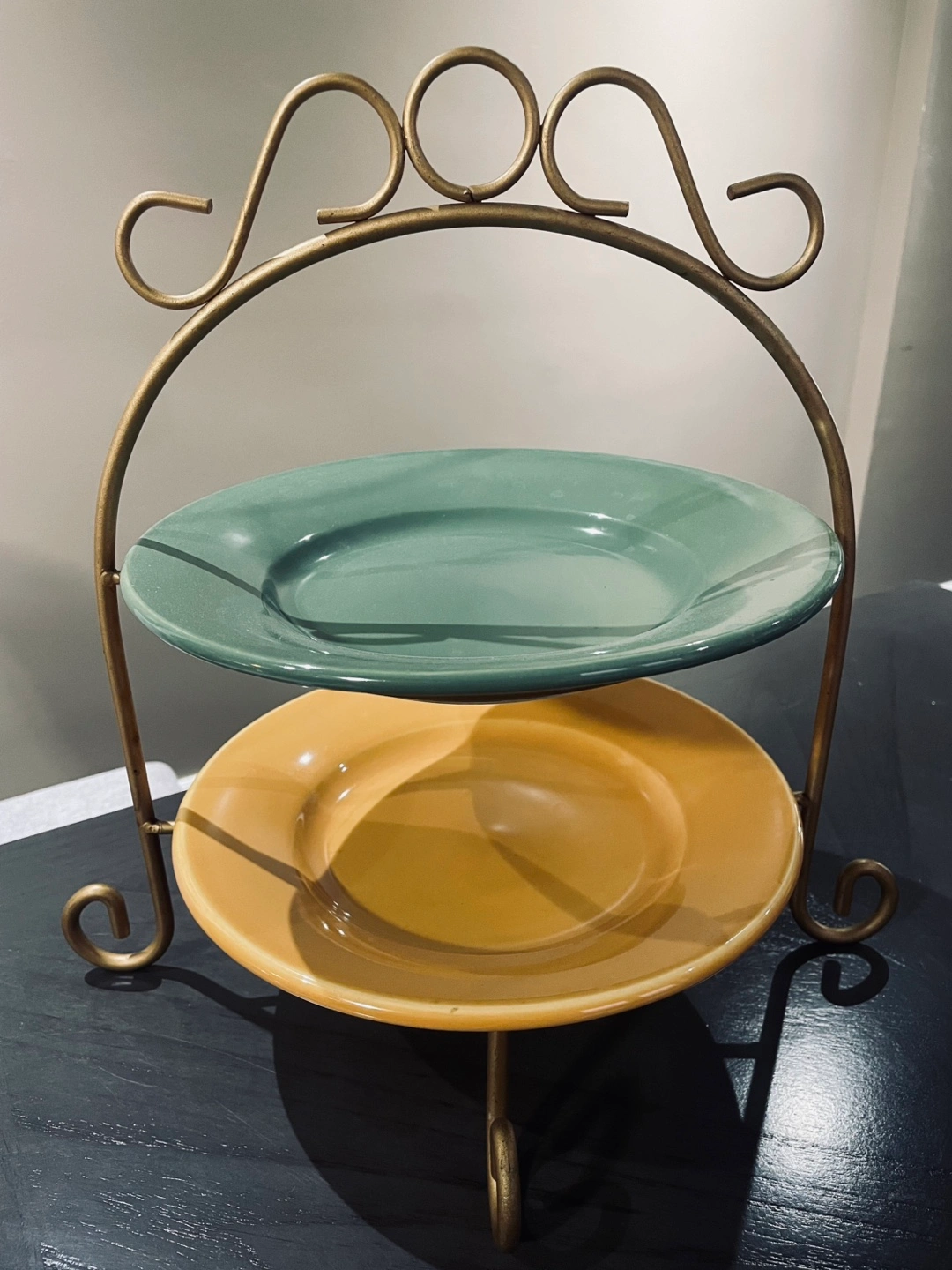 Here's a lovely two-tier serving stand! It features a gold-tone metal frame with decorative swirls and two coloured plates. The top plate is a nice muted green, and the bottom plate is a warm yellow colour. Great for displaying snacks or desserts at your next get-together!