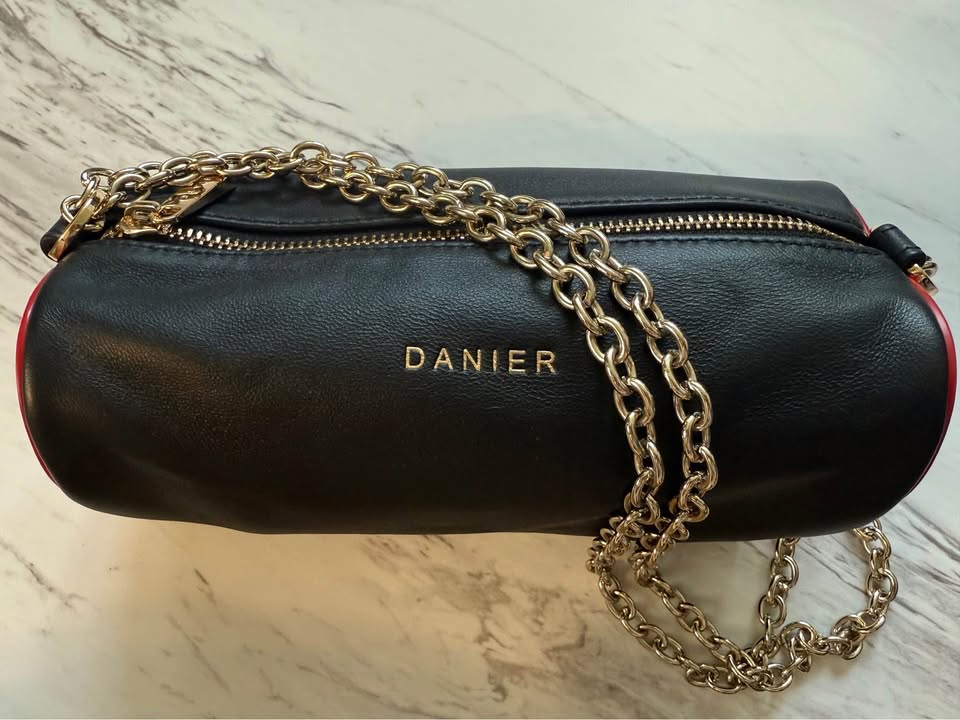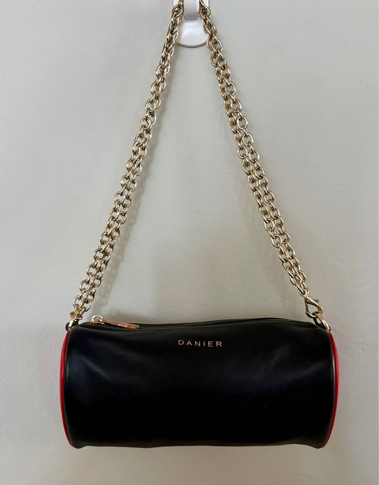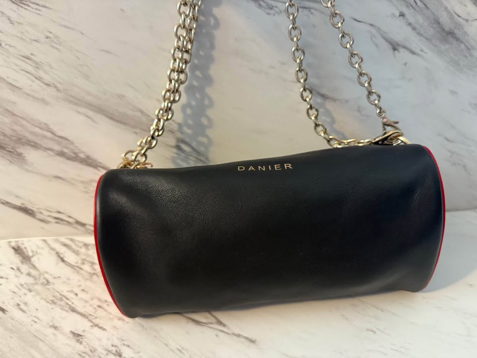 Danier Dreana black and red leather tubular heart bag with chain strap only (have it doubled up in photos for shorter option but can be attached differently for longer strap)
