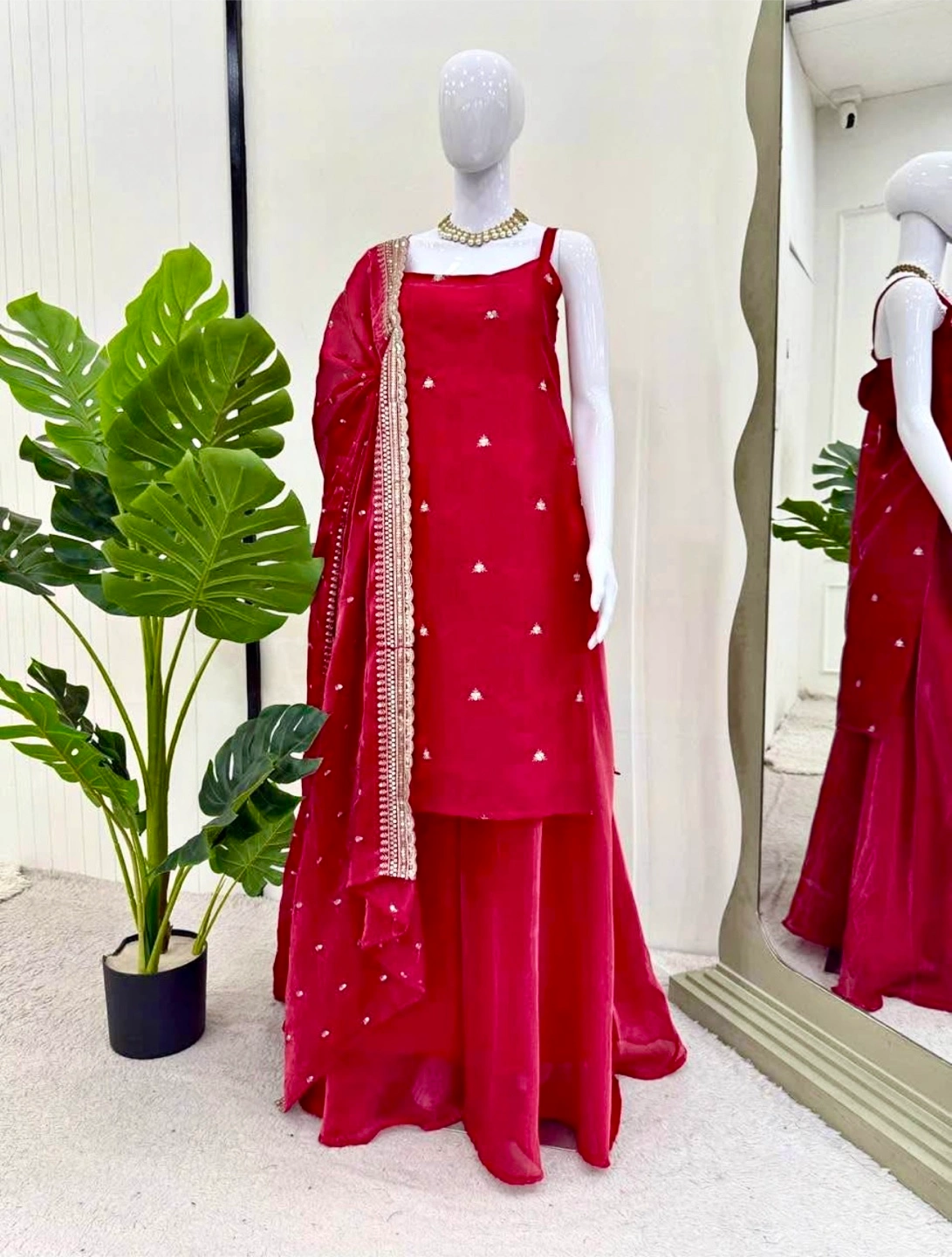 Beautiful red suit, perfect for a special occasion! The set includes a tunic-style top, wide-leg pants (palazzo style), and a matching dupatta. The fabric has a lovely drape and subtle detailing.