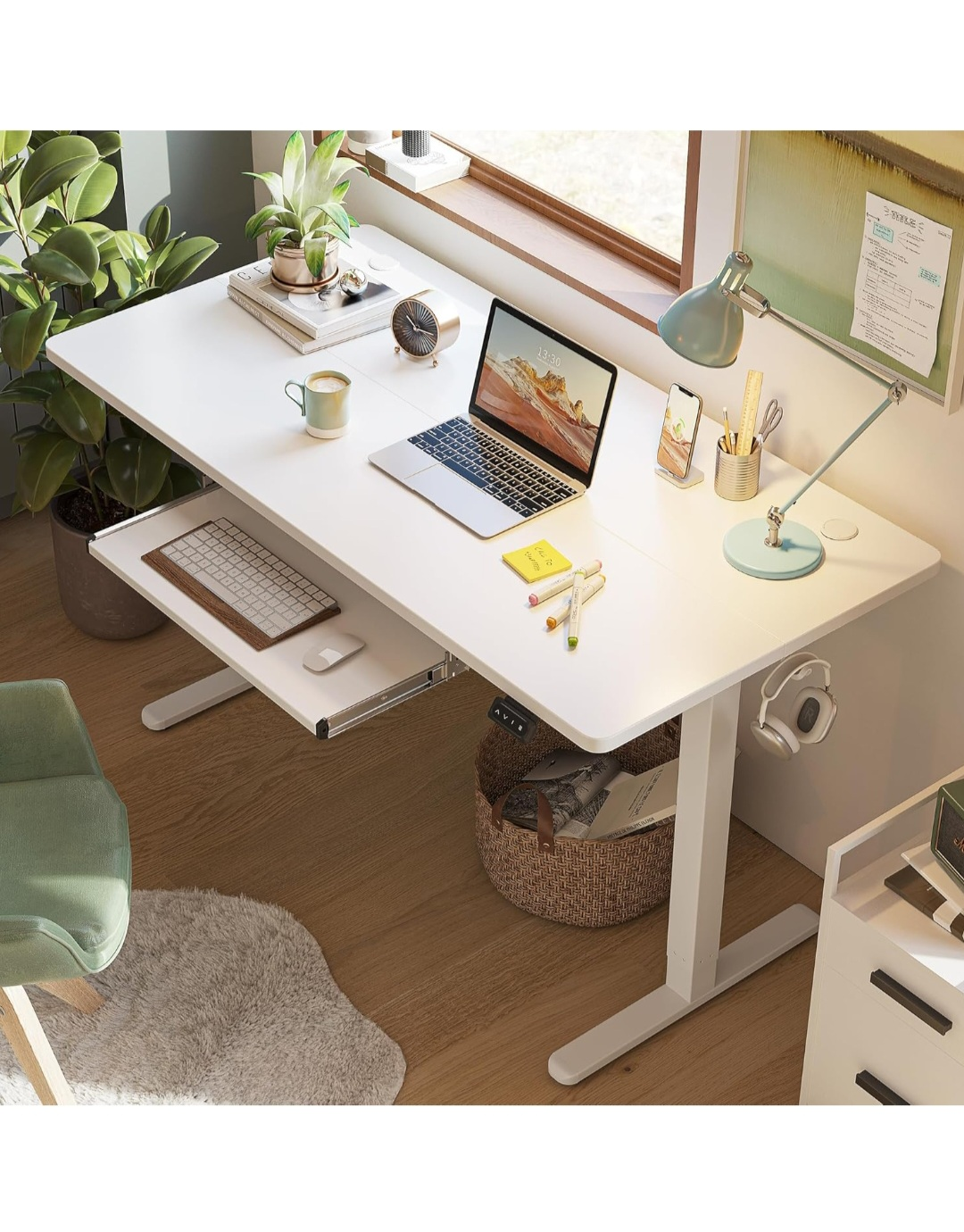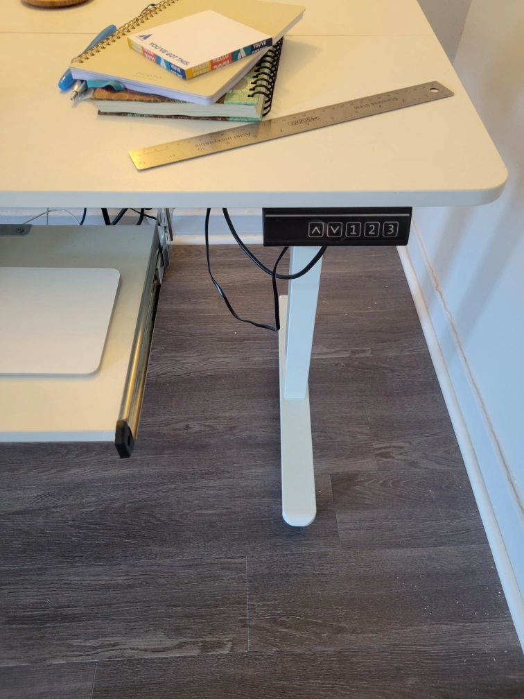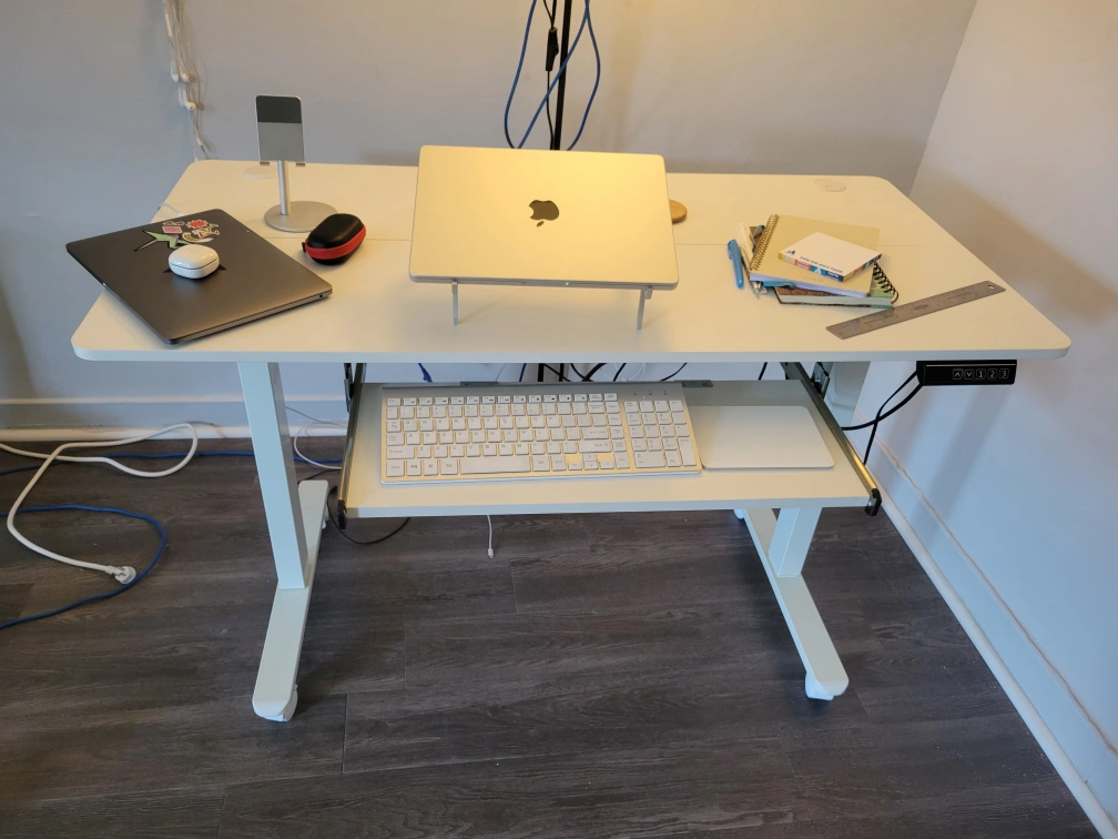 Selling a white standing desk in great condition! It's perfect for working from home or for students. The desk is height adjustable, so you can easily switch between sitting and standing. It also has a keyboard tray.