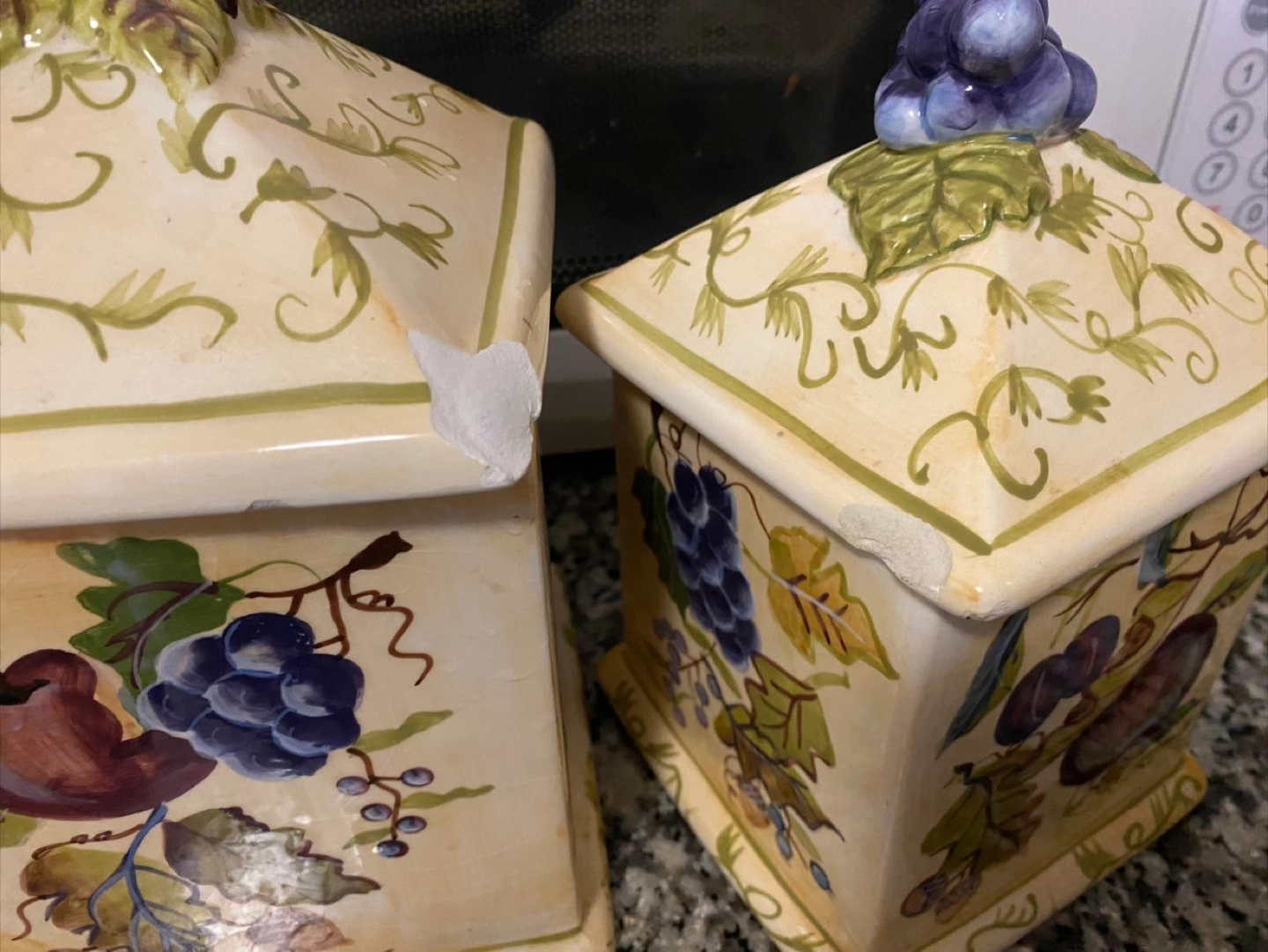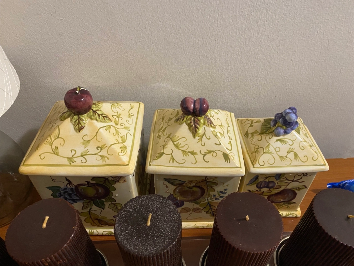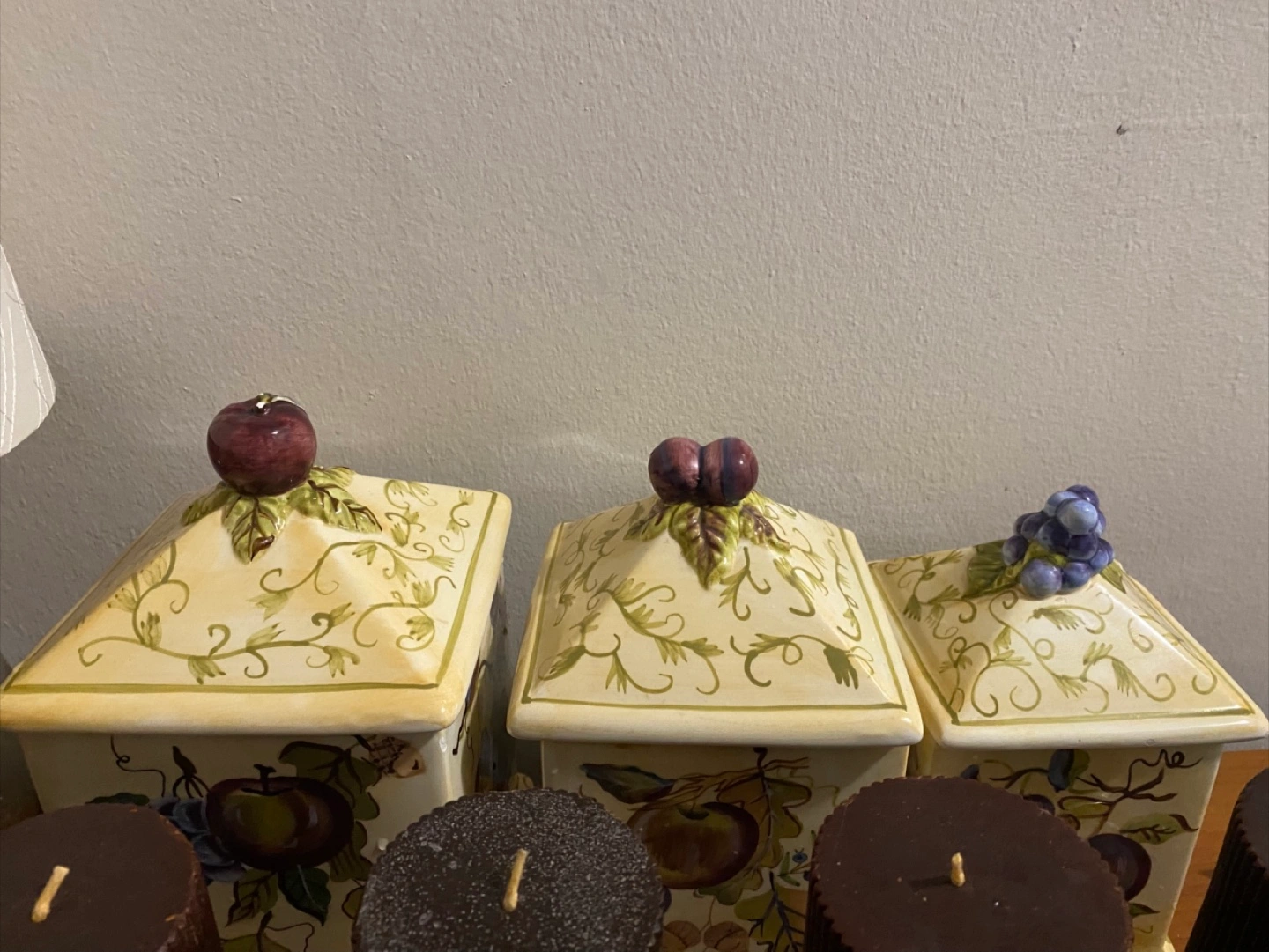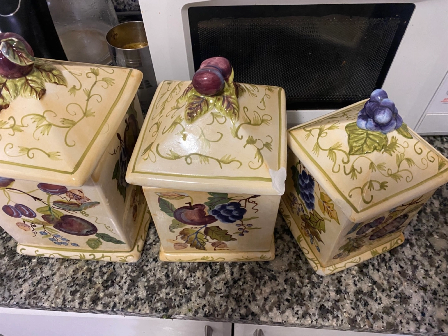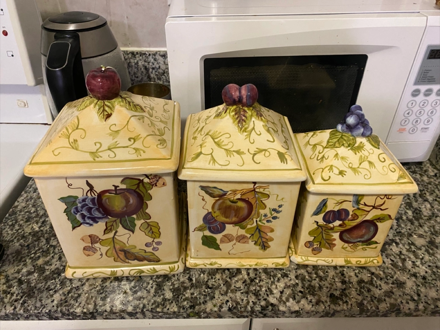 Selling a set of three ceramic canisters. They are decorated with fruit designs and have fruit shaped knobs on top. There are some chips on the edges of the canisters, as shown in the photos.