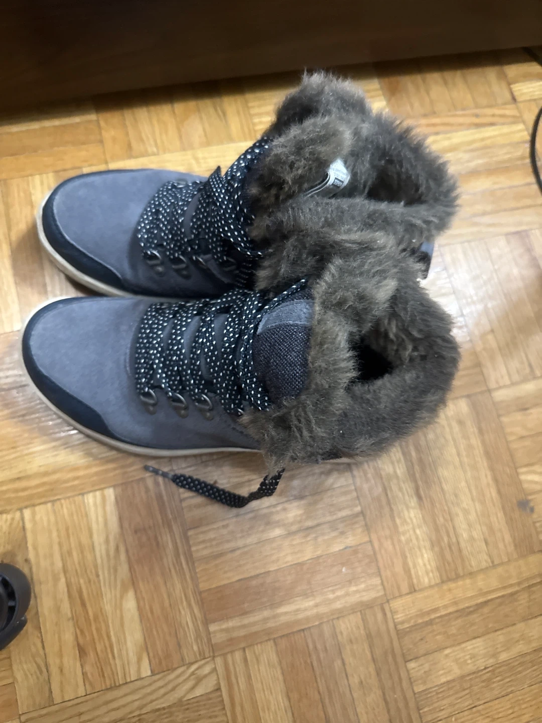 Selling a pair of Quechua SH500 X-Warm Mid women's boots in size 6.5. These are grey and feature a cozy fur trim. Perfect for keeping your feet warm and dry during the colder months! Price $40