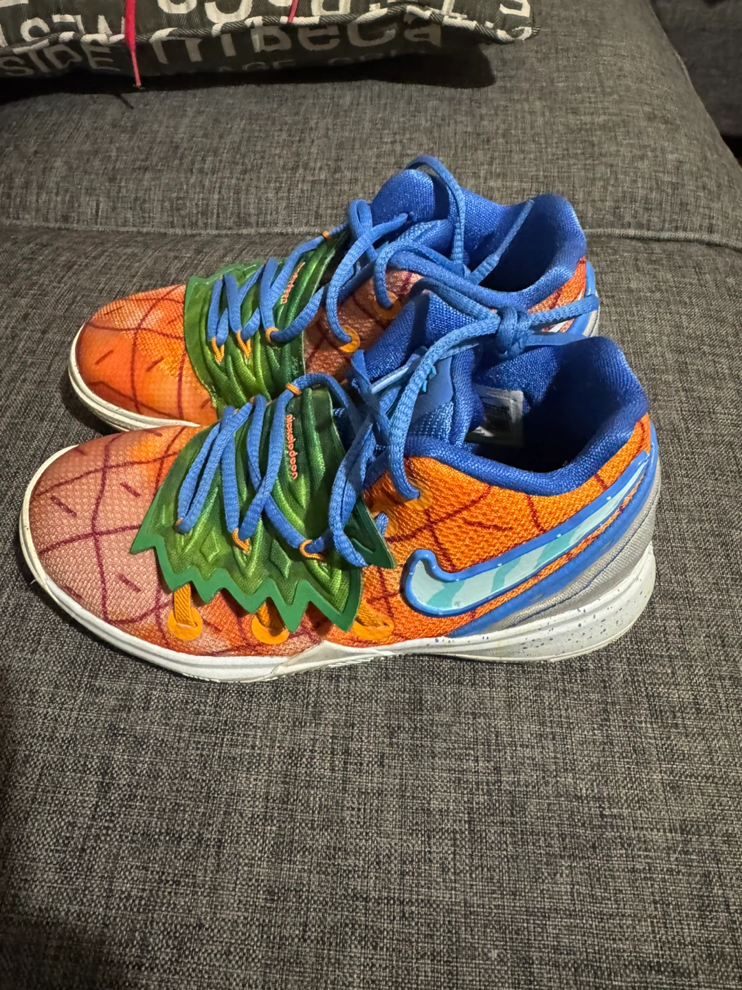 These Nike Kyrie 5 shoes are a fun collaboration with Spongebob Squarepants, featuring a Pineapple House design! They're in great condition and ready for a new home