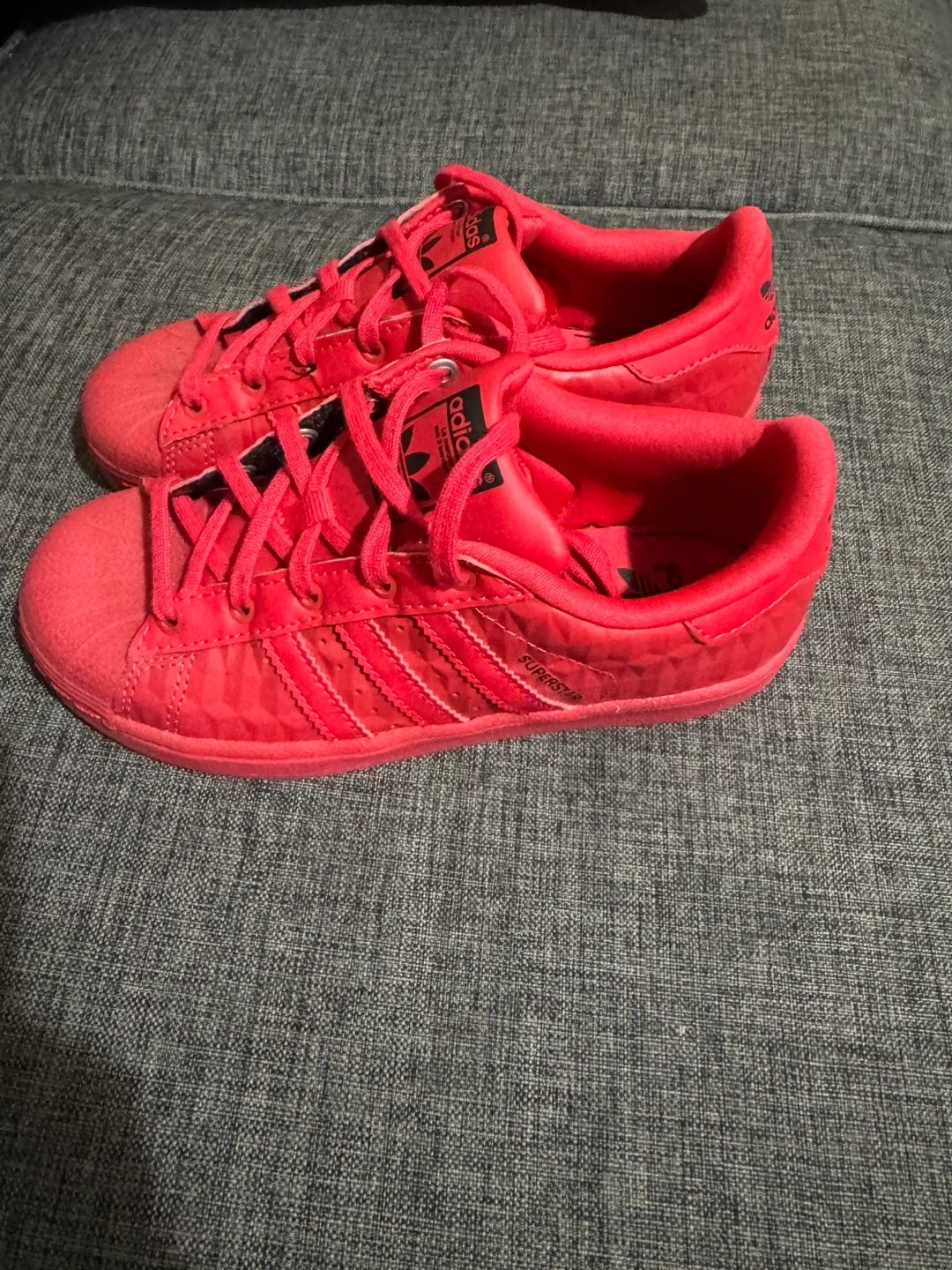 Selling a pair of Adidas Superstar sneakers in red! These are a stylish and comfortable choice for everyday wear. They show some signs of wear, but still have lots of life left in them!