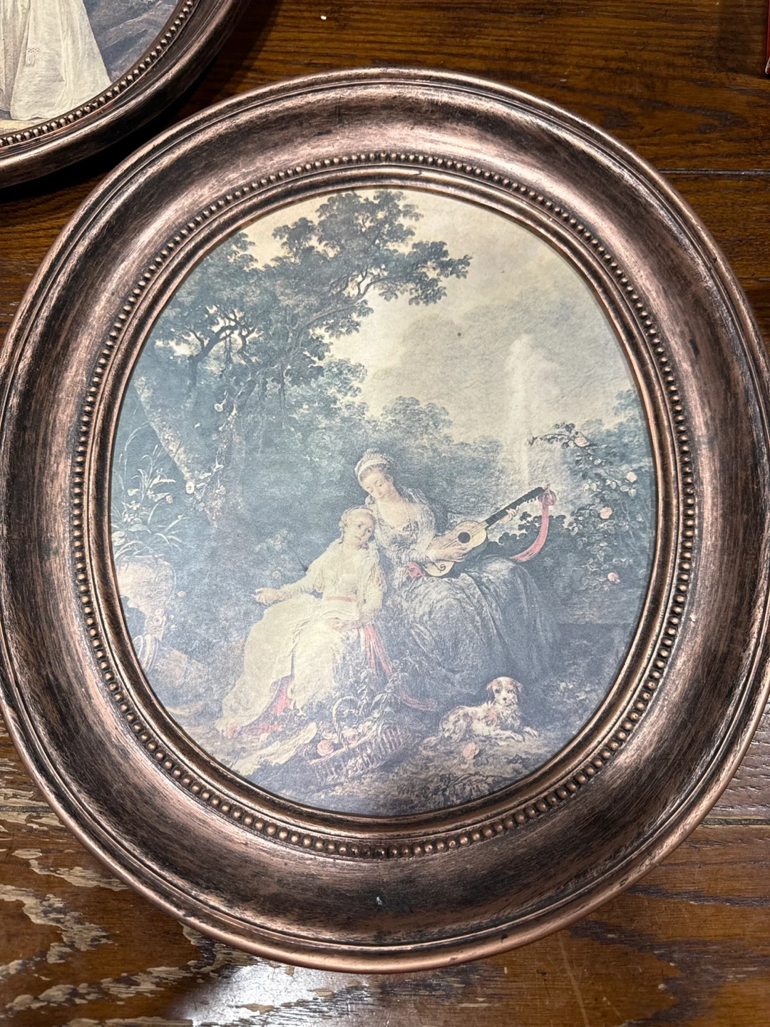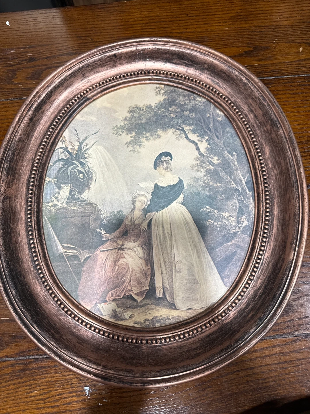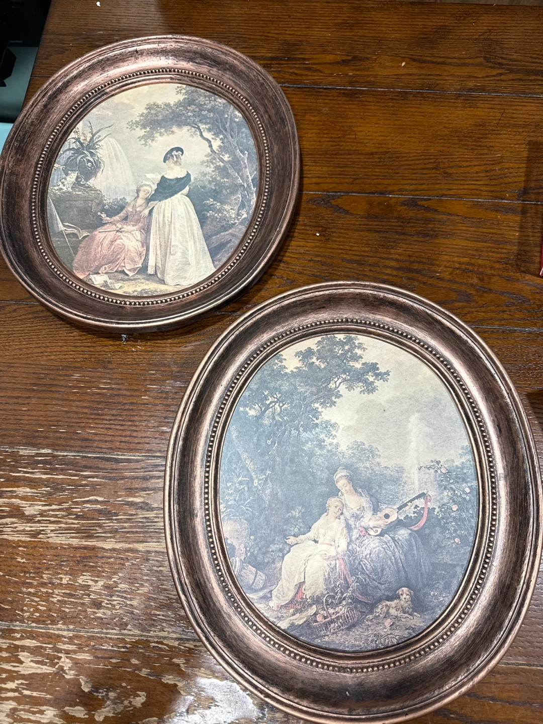 Selling a set of two vintage oval framed wall art prints. These beautiful prints feature classic scenes and would add a touch of elegance to any room. The frames have a lovely bronze-tone finish. Perfect for adding a vintage touch to your home decor!