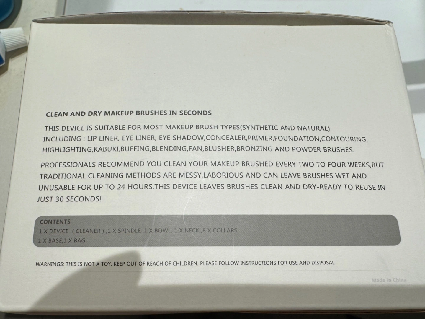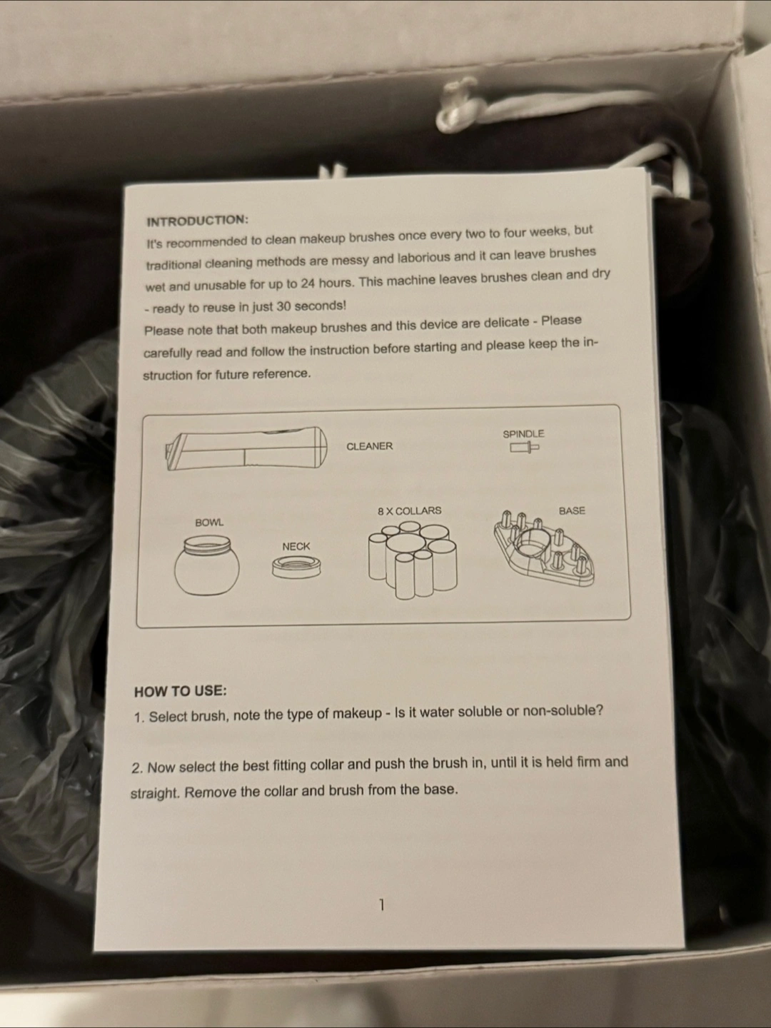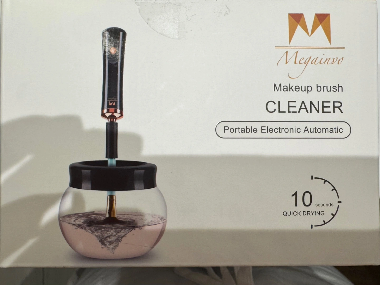 376Keep your makeup brushes clean with this portable and automatic brush cleaner from Megainvo! It's designed to clean and dry makeup brushes in seconds, working with both synthetic and natural bristles. The box includes the device (cleaner), spindle, bowl, neck, 8 x collars, base, and a bag. It's a quick and easy way to keep your brushes in tip-top shape