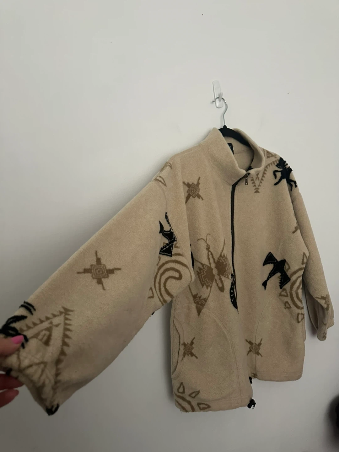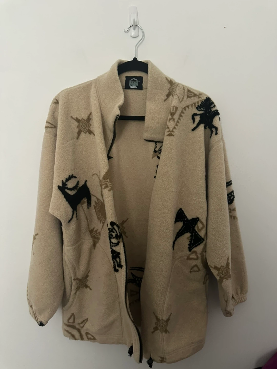 Cozy fleece jacket featuring a unique indigenous -inspired design. Perfect for adding a touch of cultural flair to your wardrobe! It has a full zip and is in great condition.