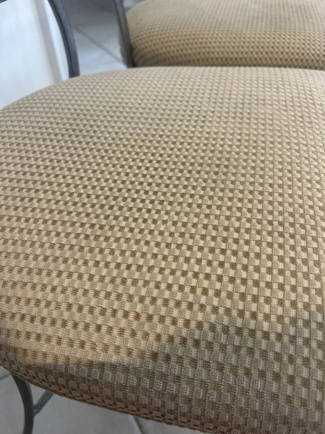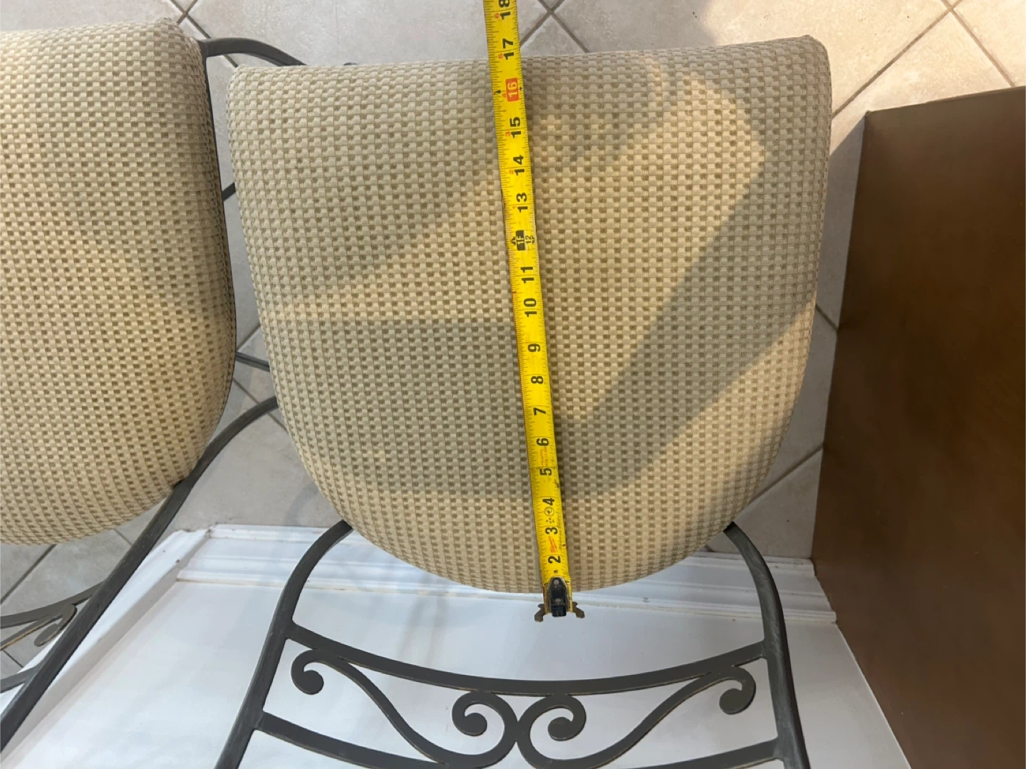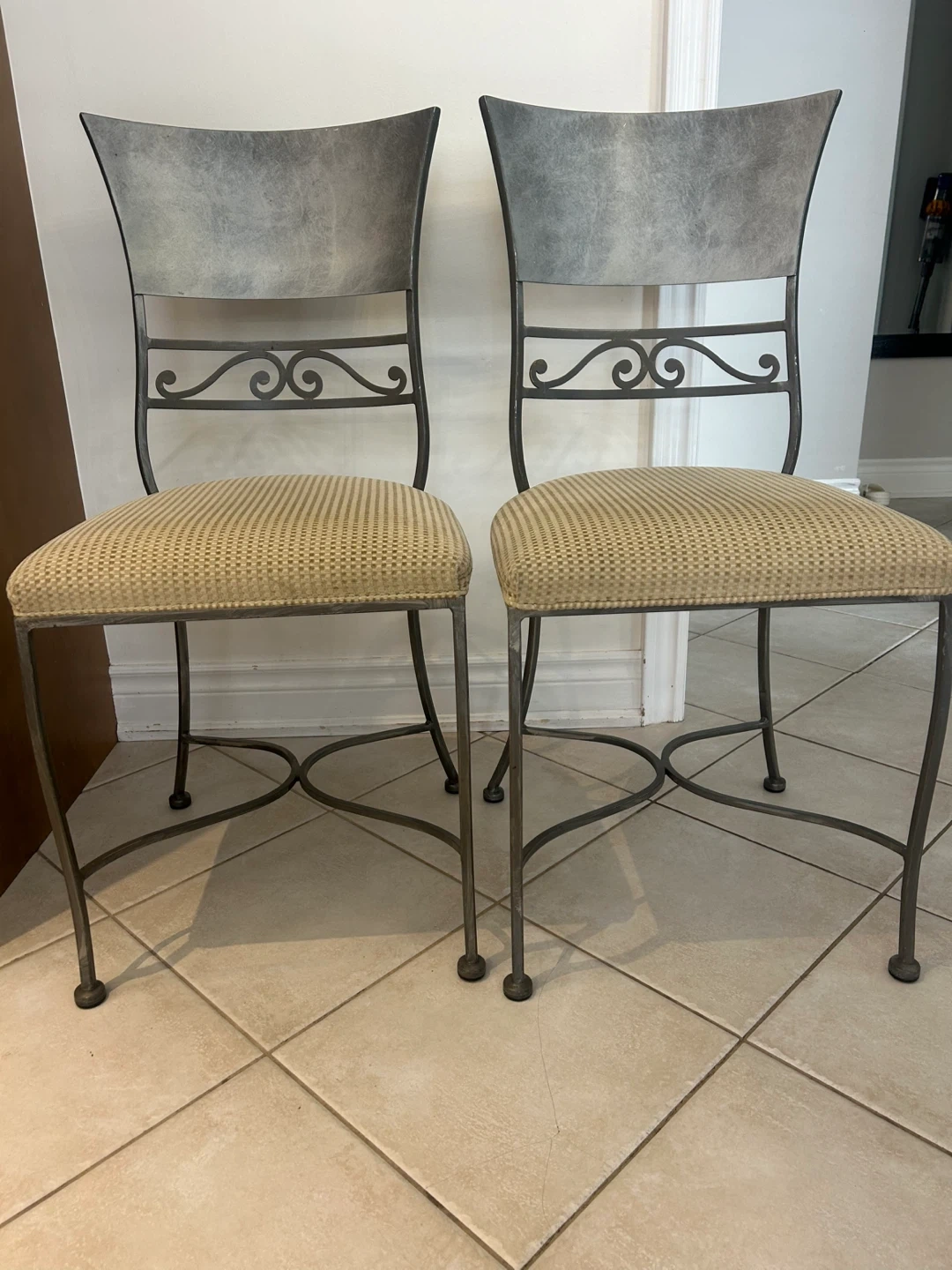 They feature a sturdy metal frame with a decorative back. The seats are upholstered in a neutral, woven fabric.