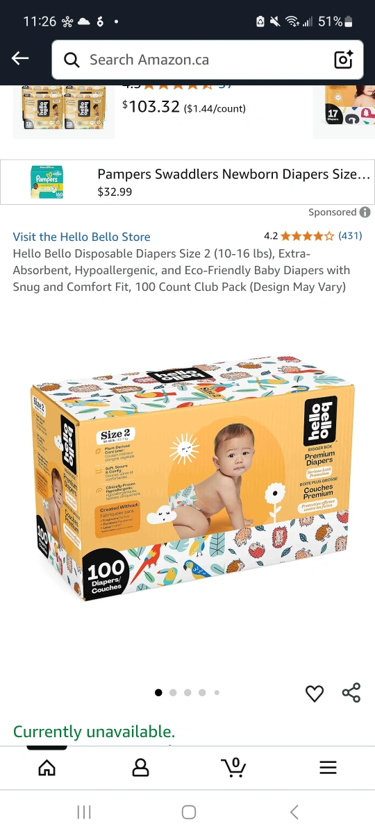 Selling a box of Hello Bello diapers, size 2 (10-16 lbs). The box contains 50 diapers and includes two cute designs! They are extra-absorbent, hypoallergenic, and eco-friendly. These diapers are made with a plant-derived core liner and are free of chlorine processing, synthetic fragrances, and lotions