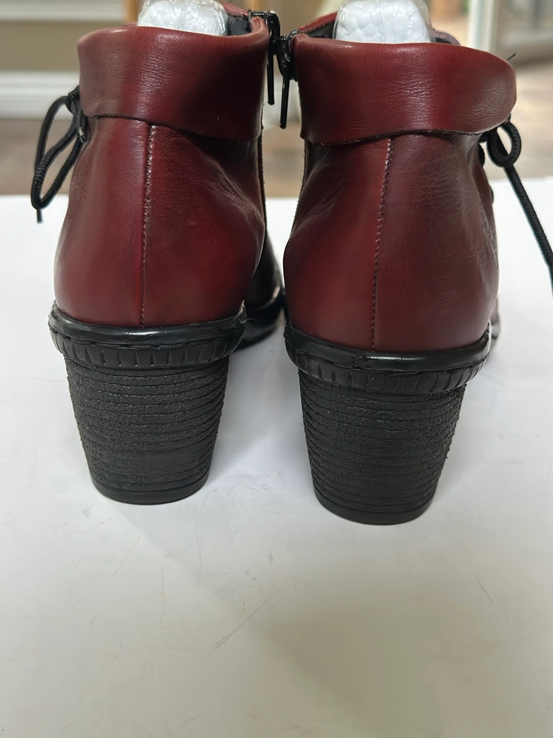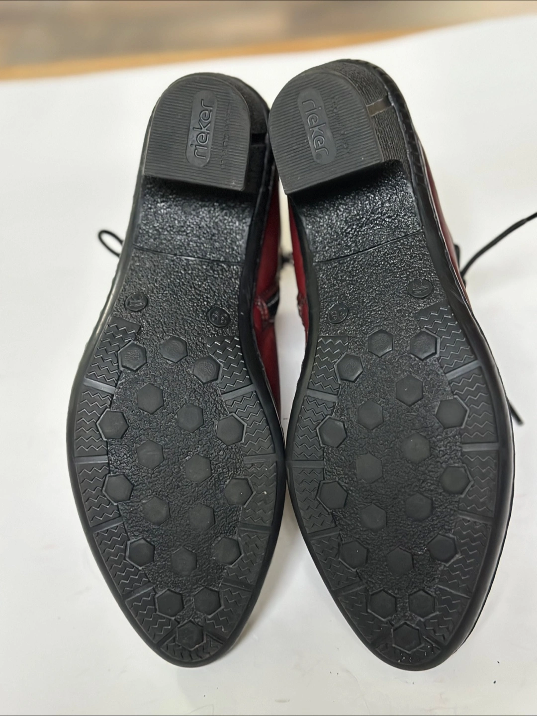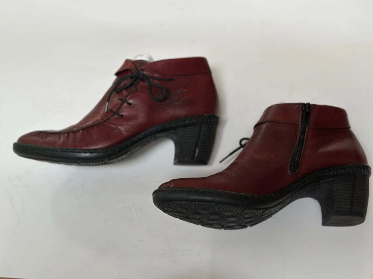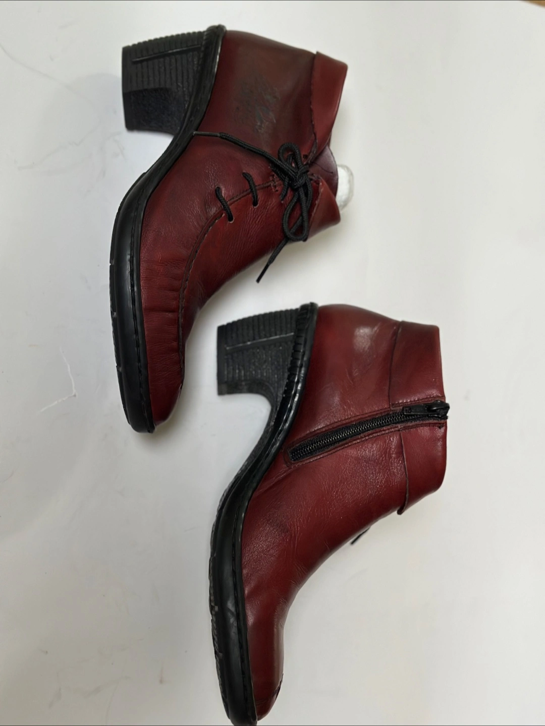 65In excellent pre-loved condition. These Rieker ankle boots are a stylish addition to any wardrobe! They are a rich burgundy colour and made of leather. Size EU 39/ US 8-8.5 They have a lace-up front and a side zipper for easy wear. These shoes have been meticulously cleaned and sanitized. From a smoke free, pet free home. Pick up in Alta Vista.