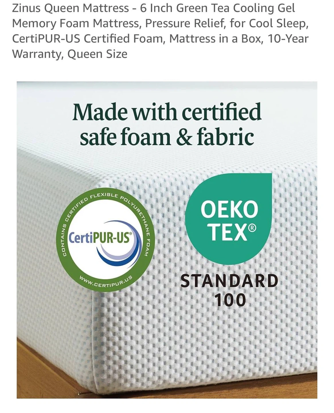 Looking to upgrade your sleep? I'm selling a Zinus Queen mattress! It's a 6-inch Green Tea Cooling Gel Memory Foam mattress designed for pressure relief and cool sleep. It's CertiPUR-US certified, ensuring safe foam and fabric. It also comes in a box with a 10-year warranty. The mattress has a medium feel, so it's not too plush or too firm