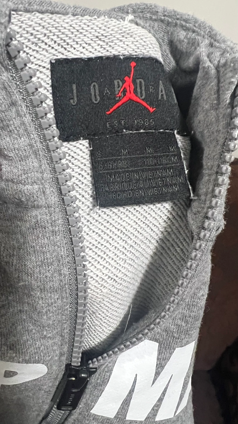 A comfy Nike Jordan tracksuit for kids! The set includes a grey zip-up hoodie and black sweatpants. Both pieces are size M and in great condition. Perfect for keeping your little one cozy and stylish!
