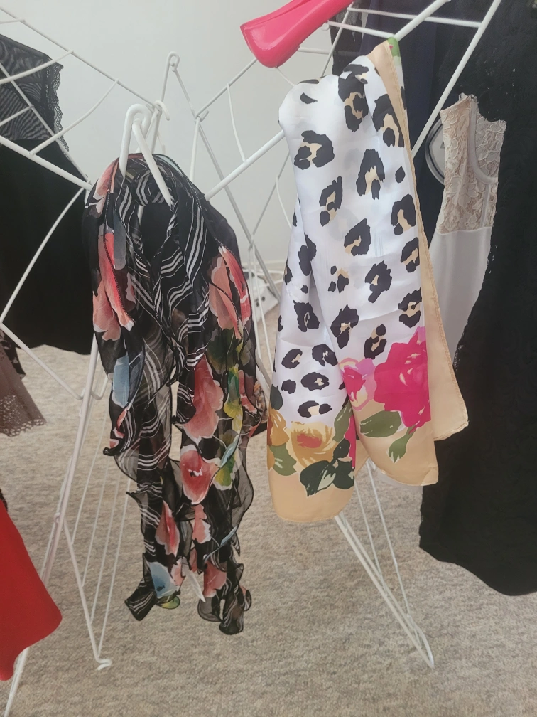 Selling a couple of scarves! One is a black and white floral print, and the other is a fun leopard print with roses. Both are in great shape and ready for a new home. Both for $5