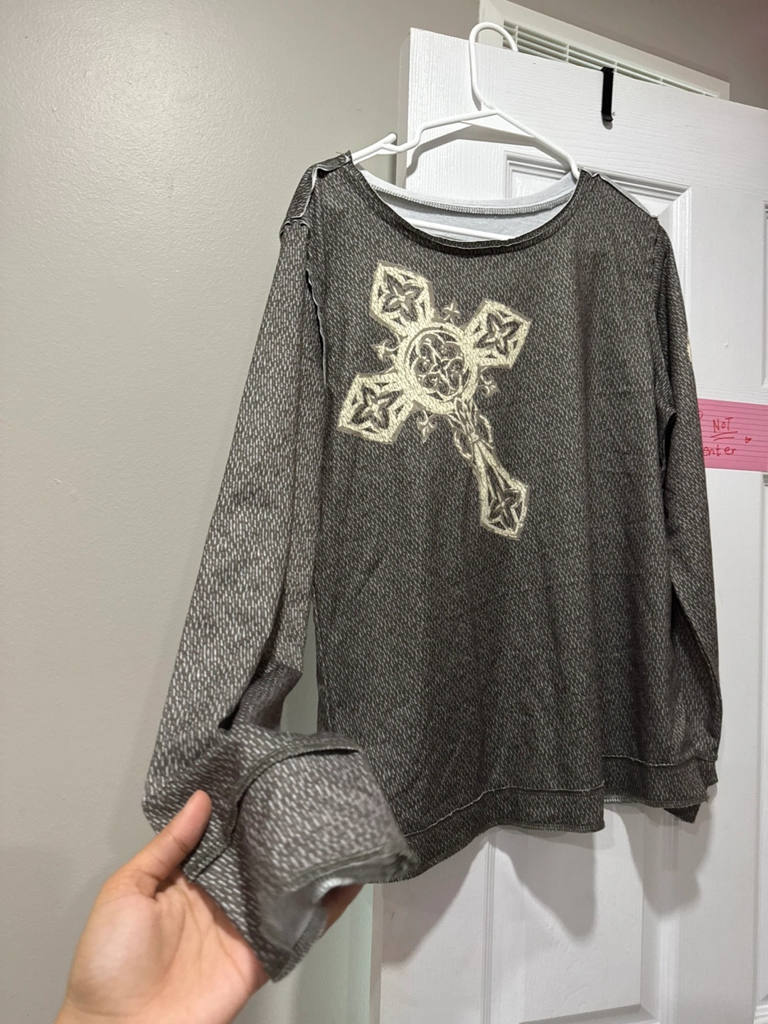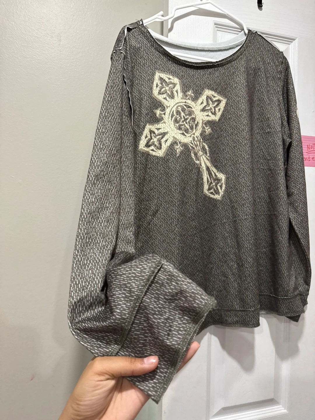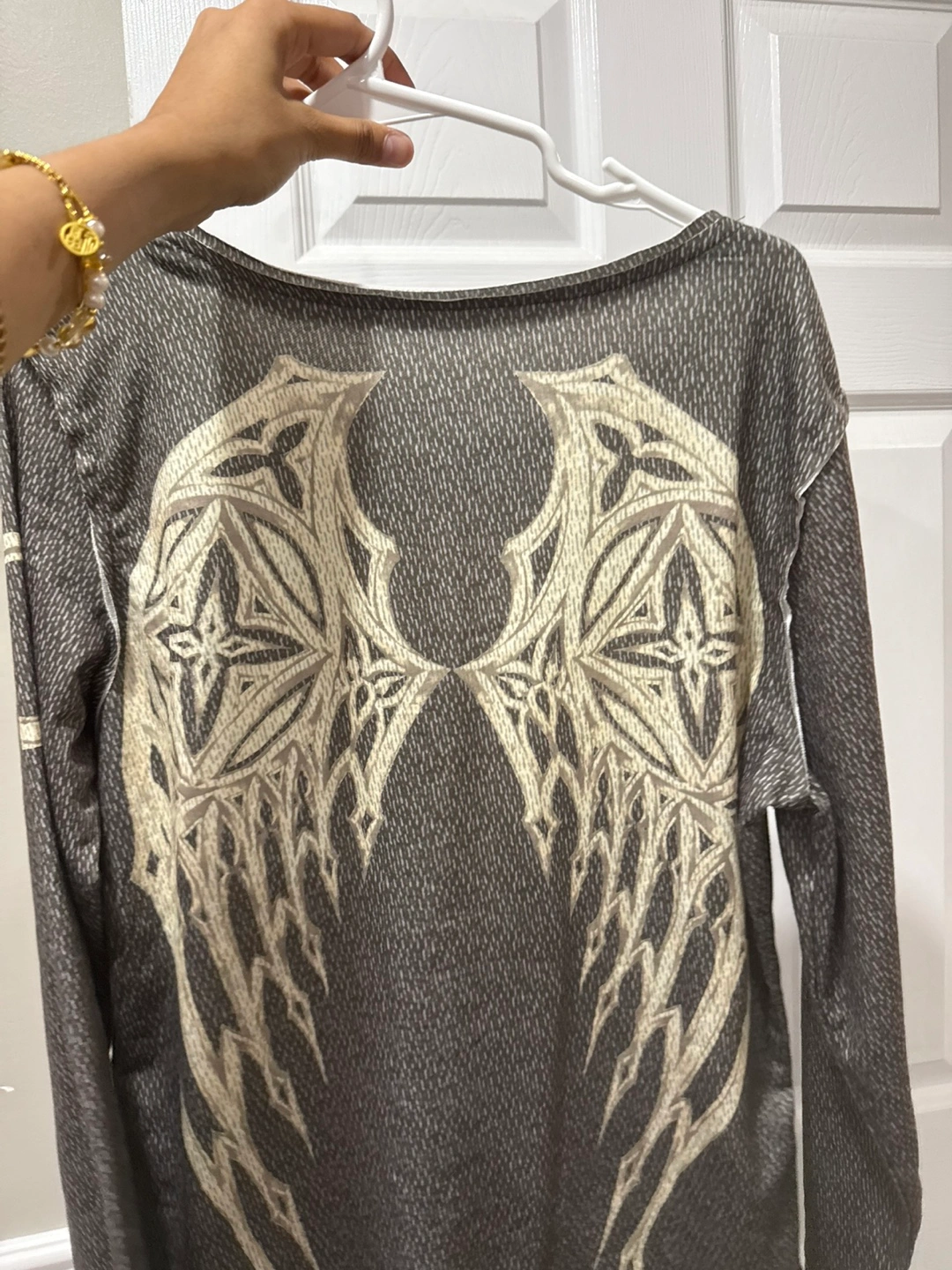 Selling a long-sleeve top with a unique design! It features a cross on the front and wings on the back. The material has a textured look. It's in good condition and ready for a new home!