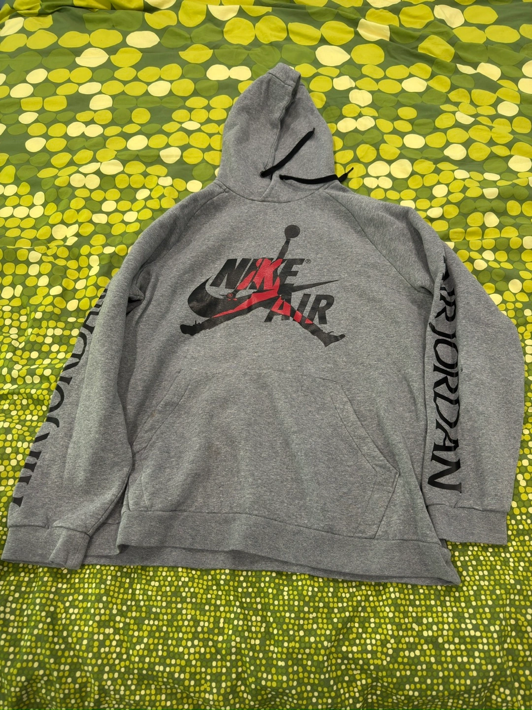 Selling a grey Nike Air Jordan hoodie in size large. It features the classic Jordan logo and lettering down the sleeves. A comfy and stylish addition to your wardrobe!