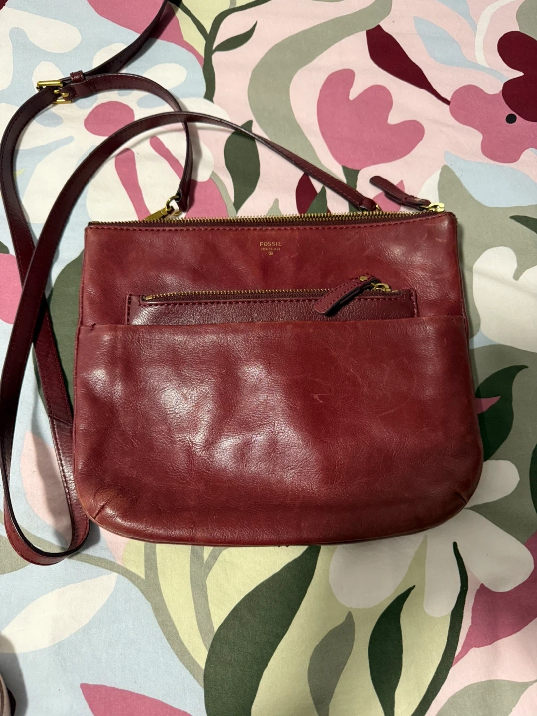 Here's a lovely Fossil crossbody bag in burgundy leather. It's perfect for everyday use and has a classic look. The bag is in good condition and ready for a new home! Clean inside and out and from a non smoking home.