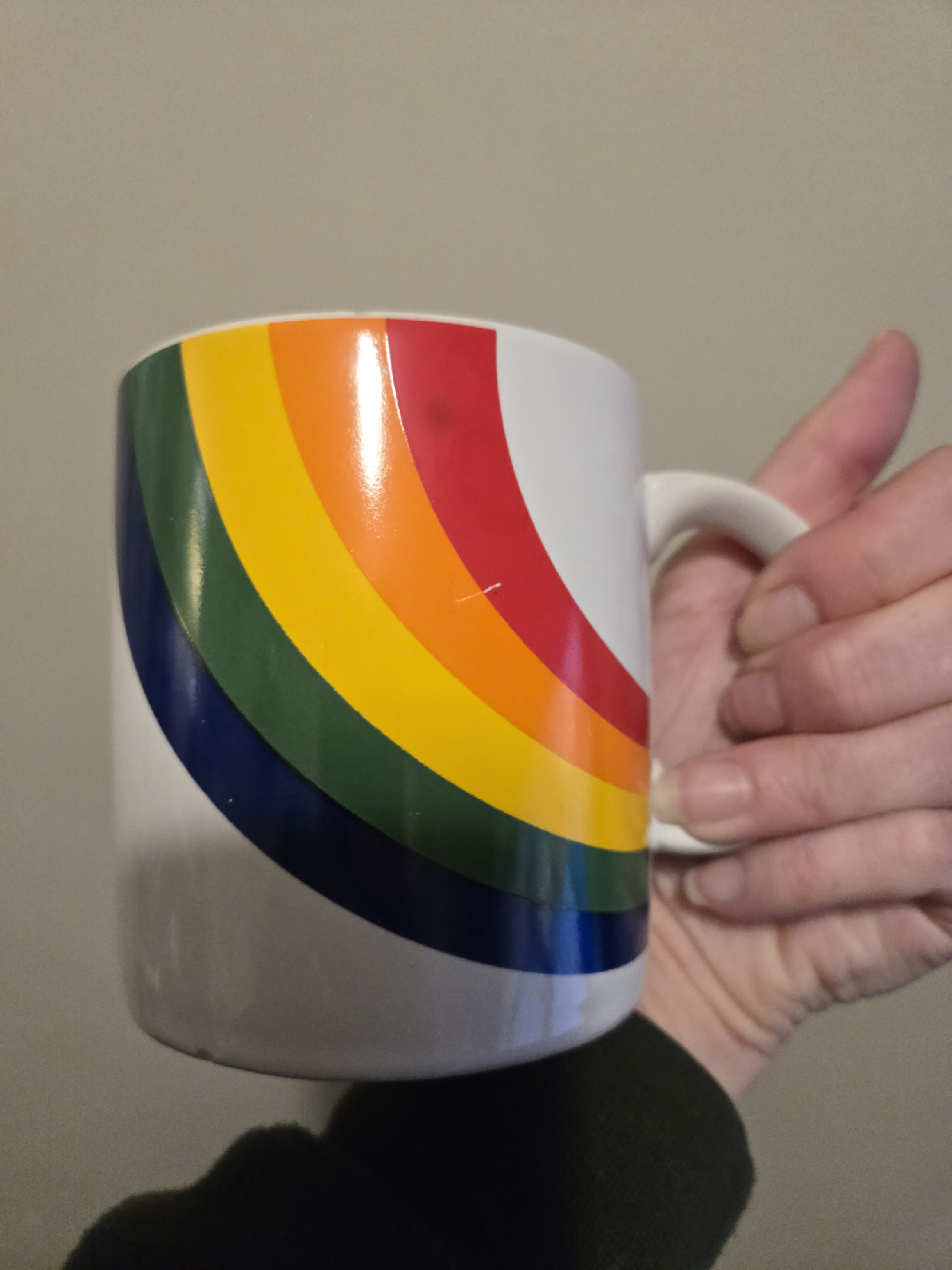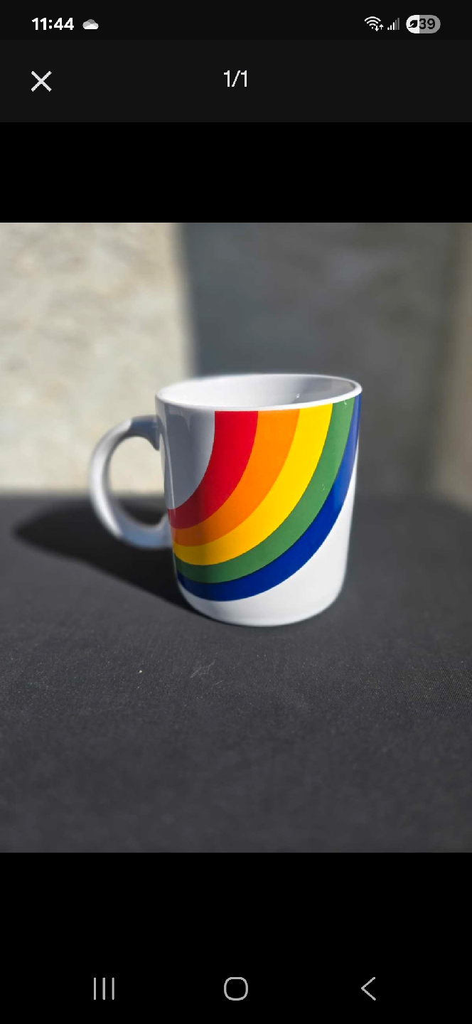 This vintage 1984 coffee mug features a vibrant rainbow design, perfect for adding a splash of colour to your morning routine. The mug is in good condition and ready for a new home. Been sitting in storage for years.