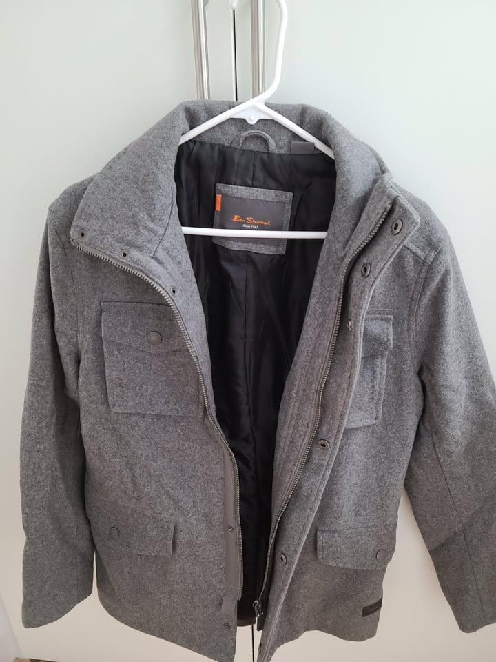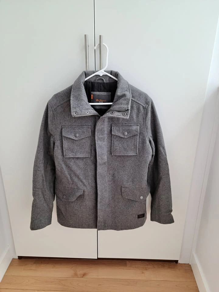 Selling a Ben Sherman gray wool blend coat/jacket - size small in excellent condition. A sharp, military style pea coat. Zip and clip closure. Has 4 exterior and 1 interior pocket. Jacket is fully lined on the inside including sleeves. Comes from a smoke & pet free home.