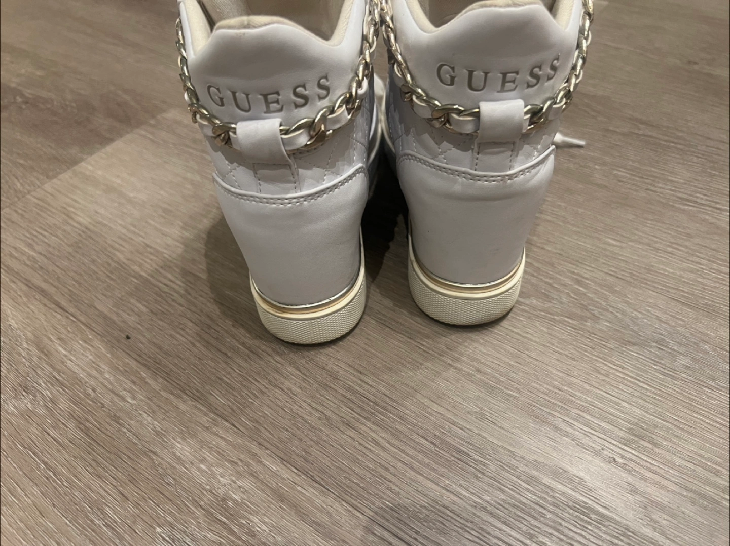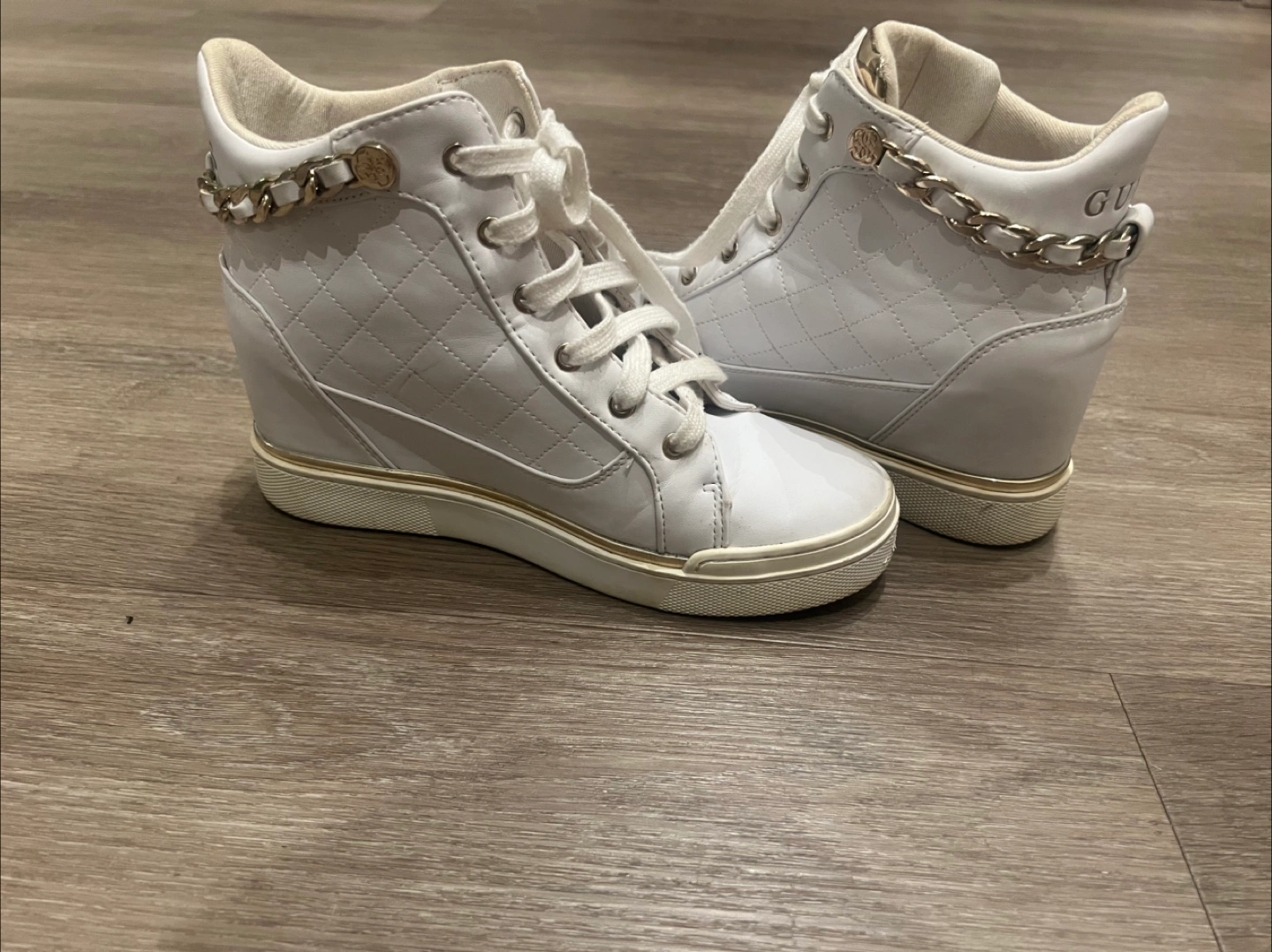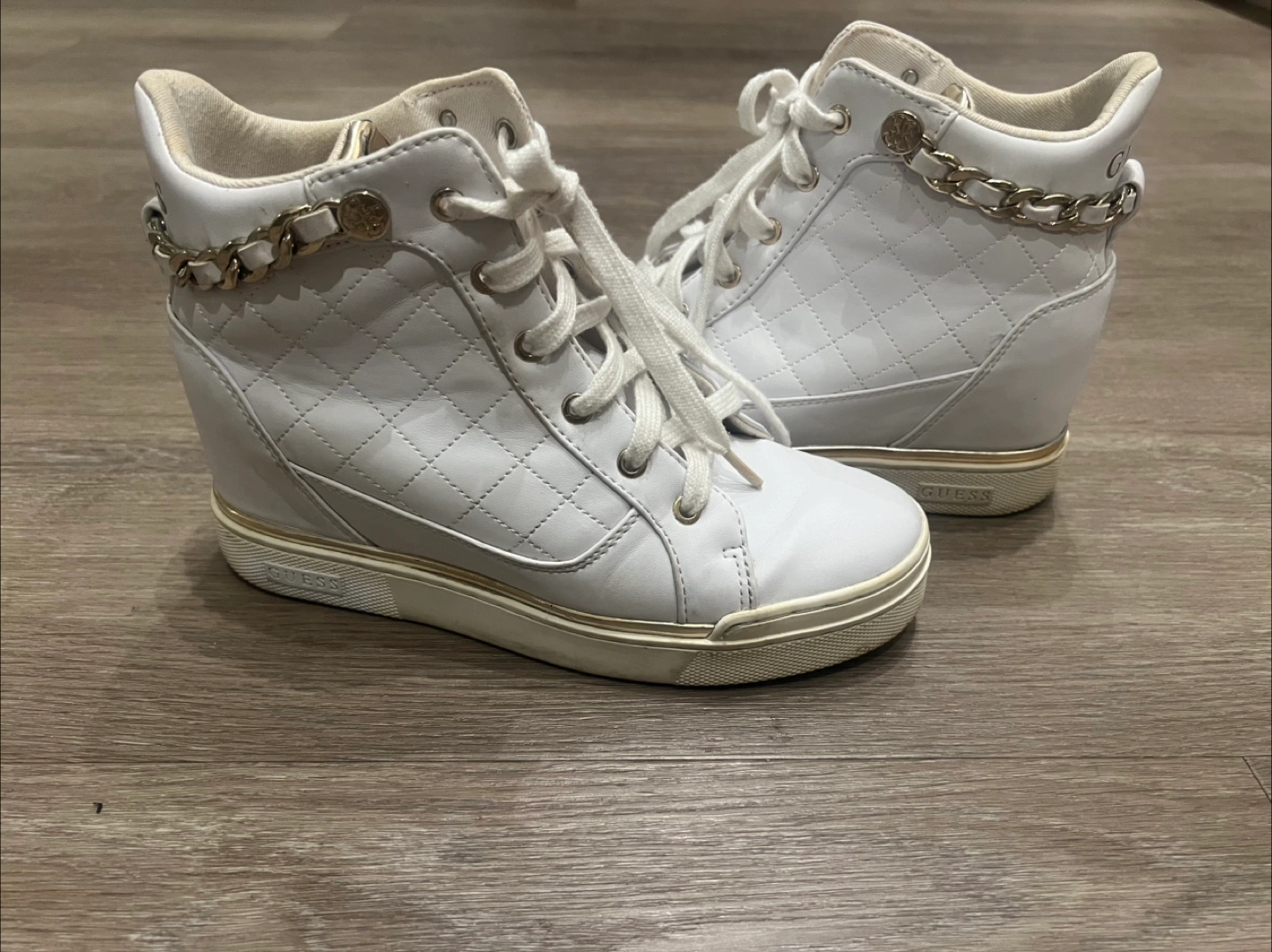 Cute pair of Guess white wedge sneakers! They have a stylish chain detail around the ankle. Great for adding a bit of height and style to any outfit. They are in good condition.
