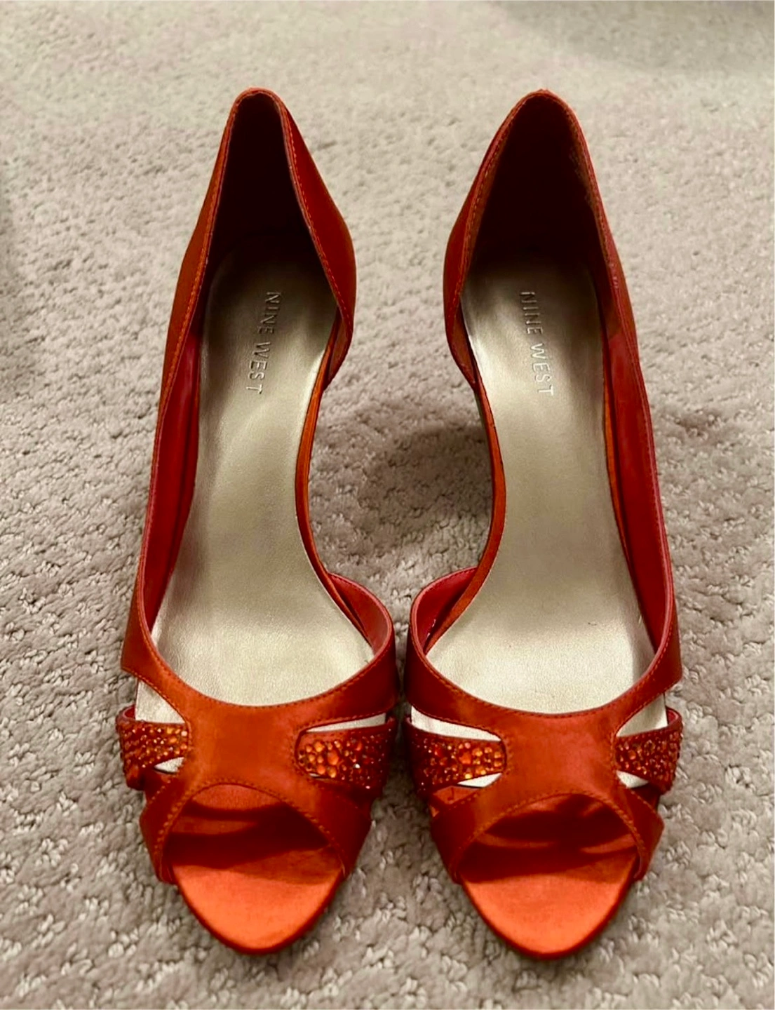 These Nine West heels are a vibrant orange colour and a size 6. They are made of satin and have a stylish, open-toe design with decorative accents. Perfect for adding a pop of colour to your outfit!