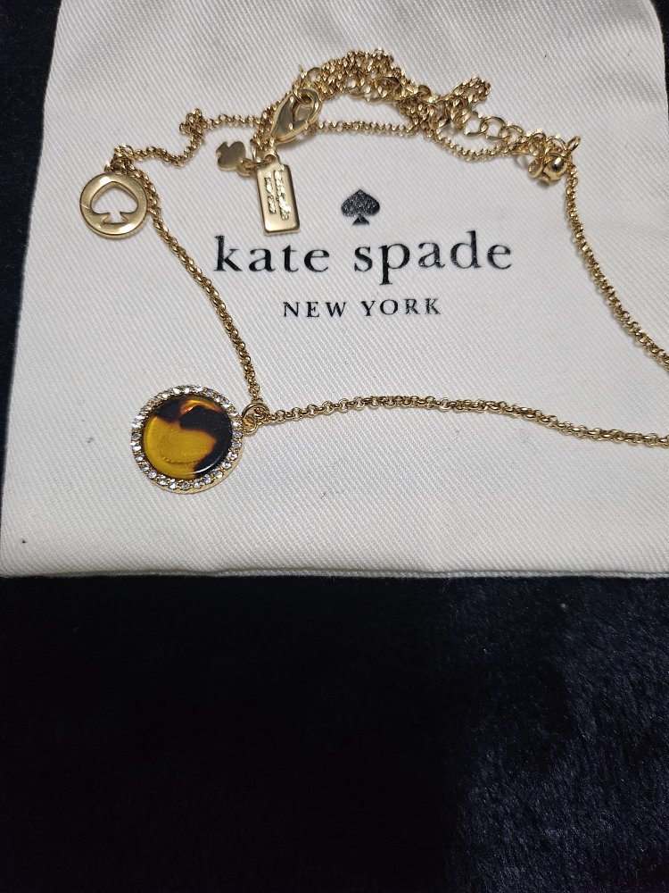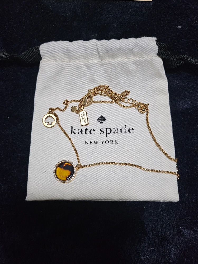 This is a beautiful Kate Spade necklace with a tiger eye pendant. It's in great condition and comes with the original Kate Spade pouch. Perfect for adding a touch of elegance to any outfit!