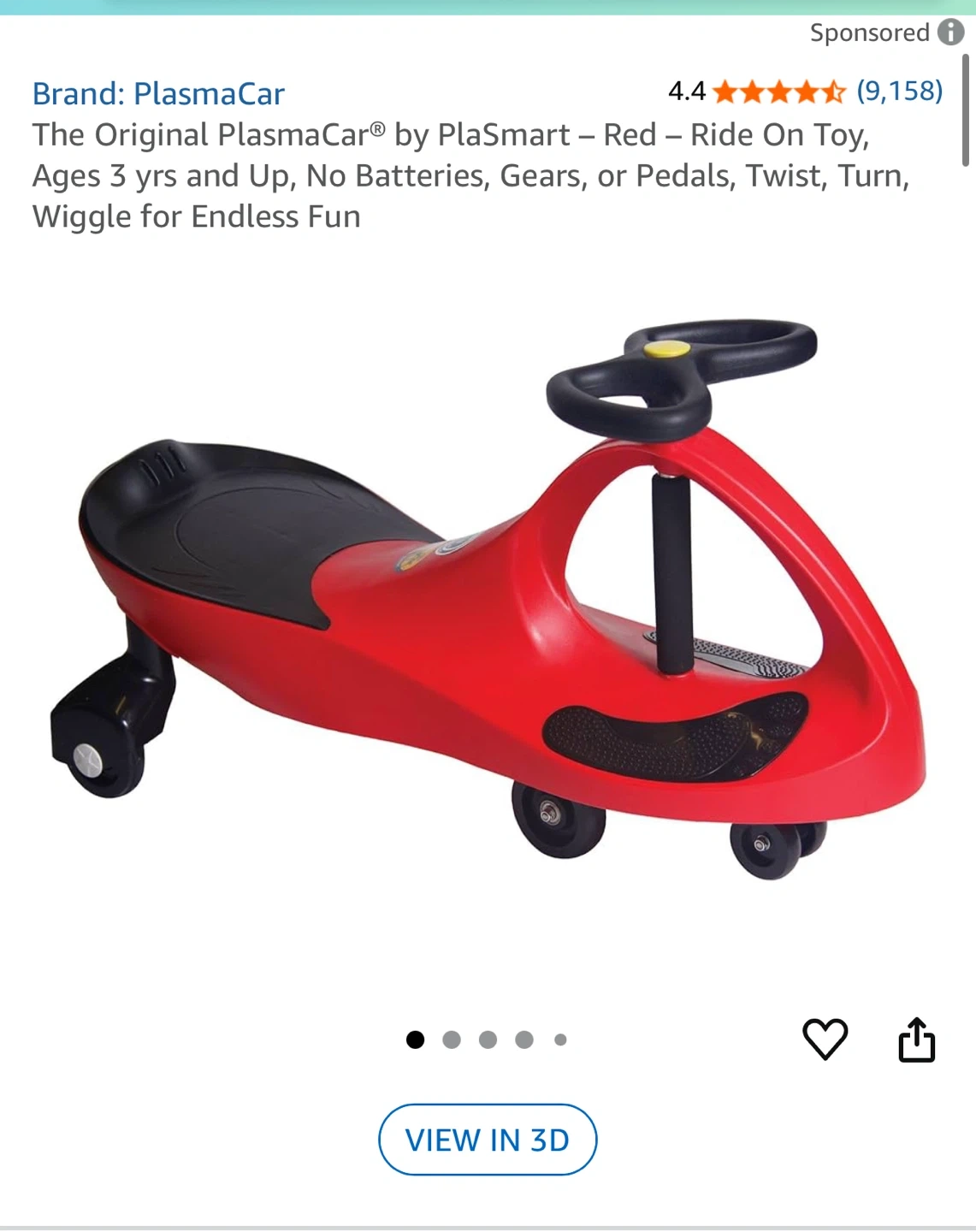 The original PlasmaCar by PlaSmart in red! This ride-on toy is suitable for ages 3 years and up. No batteries, gears, or pedals are required. Just twist, turn, and wiggle for endless fun!