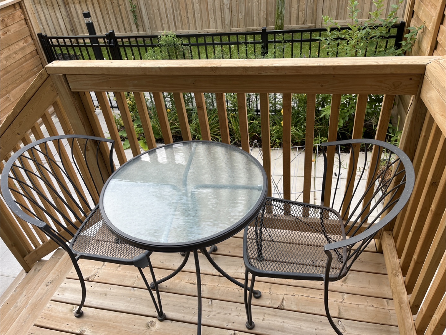 Selling a patio table and chairs set, perfect for enjoying the outdoors! The set includes a round glass table and two matching chairs and 2 cushions. It's in good condition and ready to enhance your outdoor space