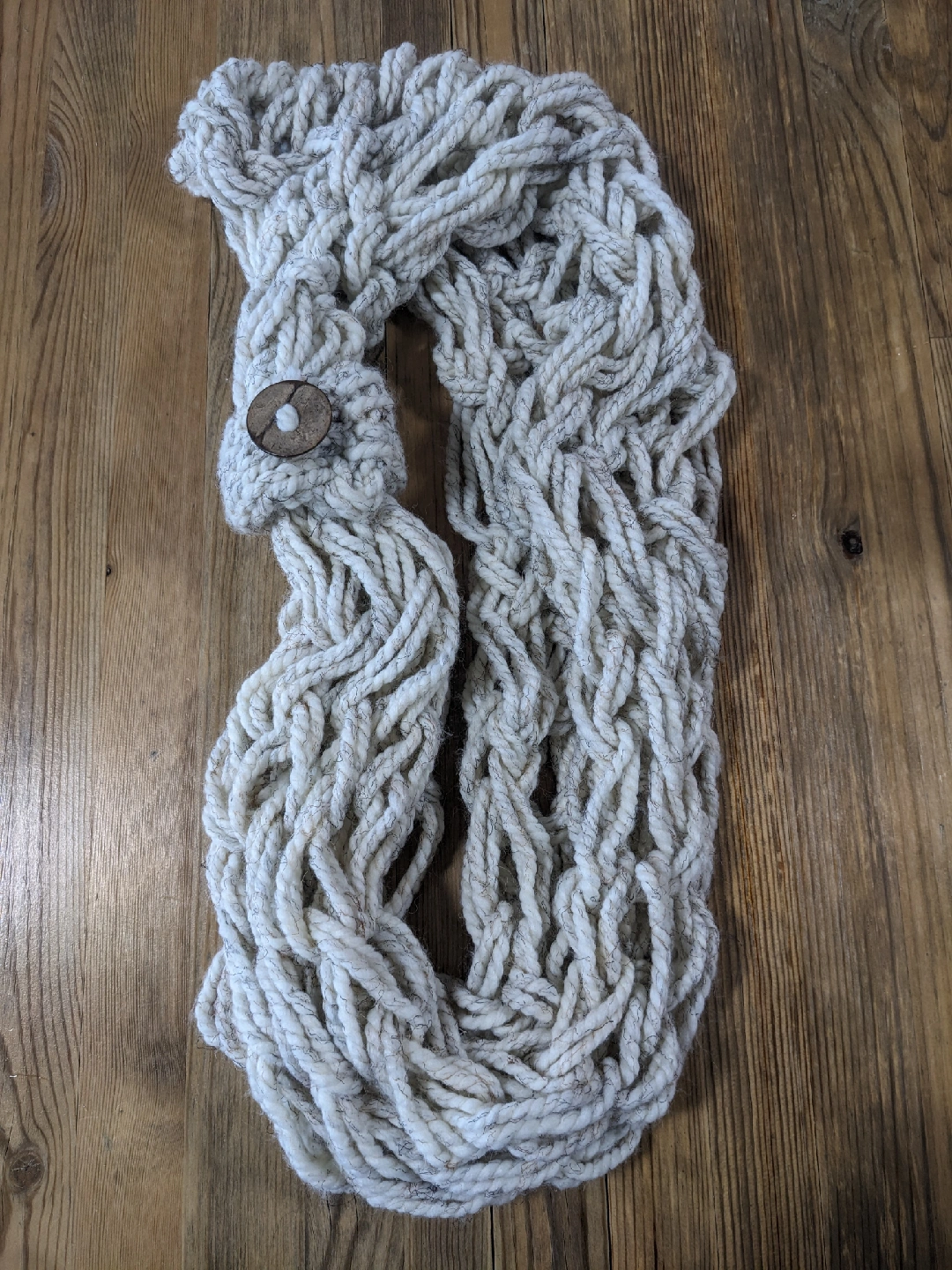 Cozy up with this handmade chunky knit infinity scarf! It's a lovely cream colour and features a unique wooden button detail. Perfect for adding a touch of warmth and style to any outfit during those chilly Canadian days