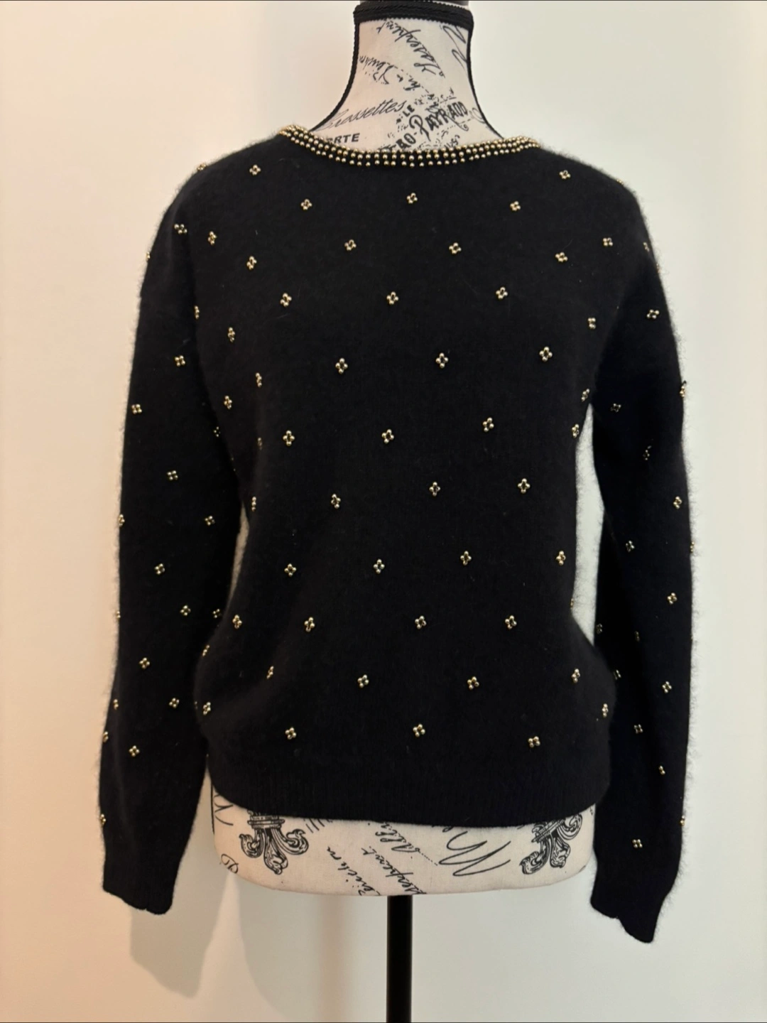 Here's a cozy black sweater with gold bead detailing around the neckline and scattered throughout the body. It's a stylish and comfortable vintage piece to add to your wardrobe for a touch of elegance! The material is super soft too! No size tag but would fit a small frame best. Cash only.